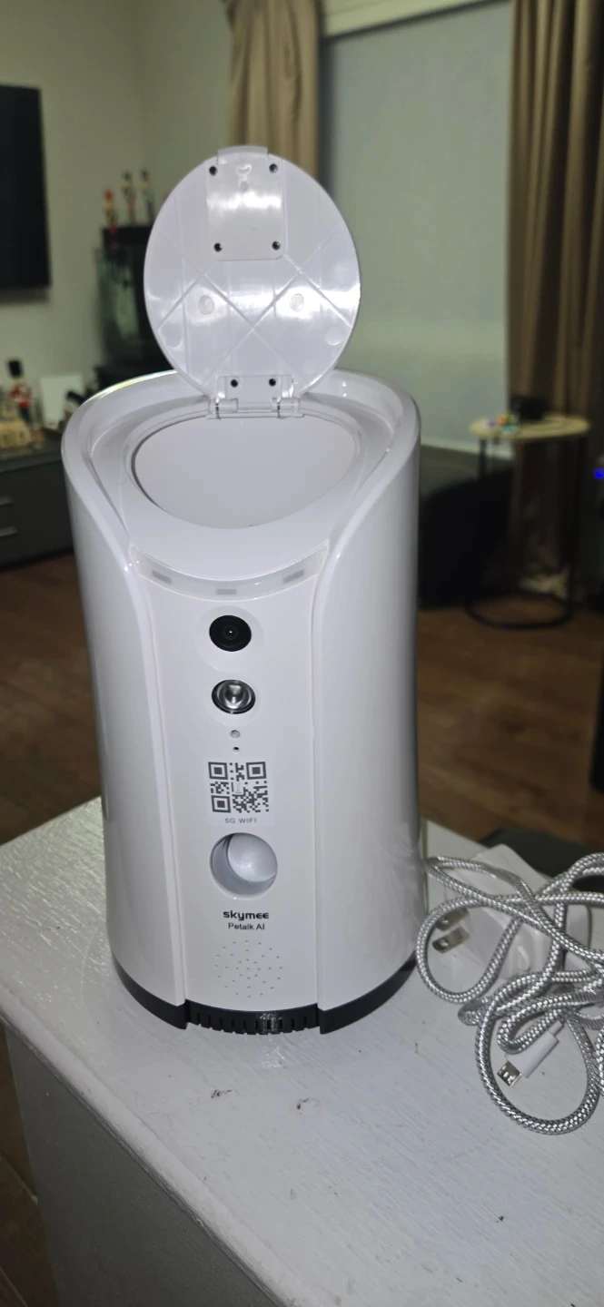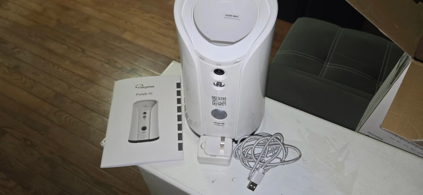 Selling a Skymee Petalk AI Dog Camera. It comes with the box, charger, and instructions. The camera features FHD video live broadcast, ability to watch online, interactive dog feeding, two-way audio, ring tone, and photo and video capabilities. It also has night vision!