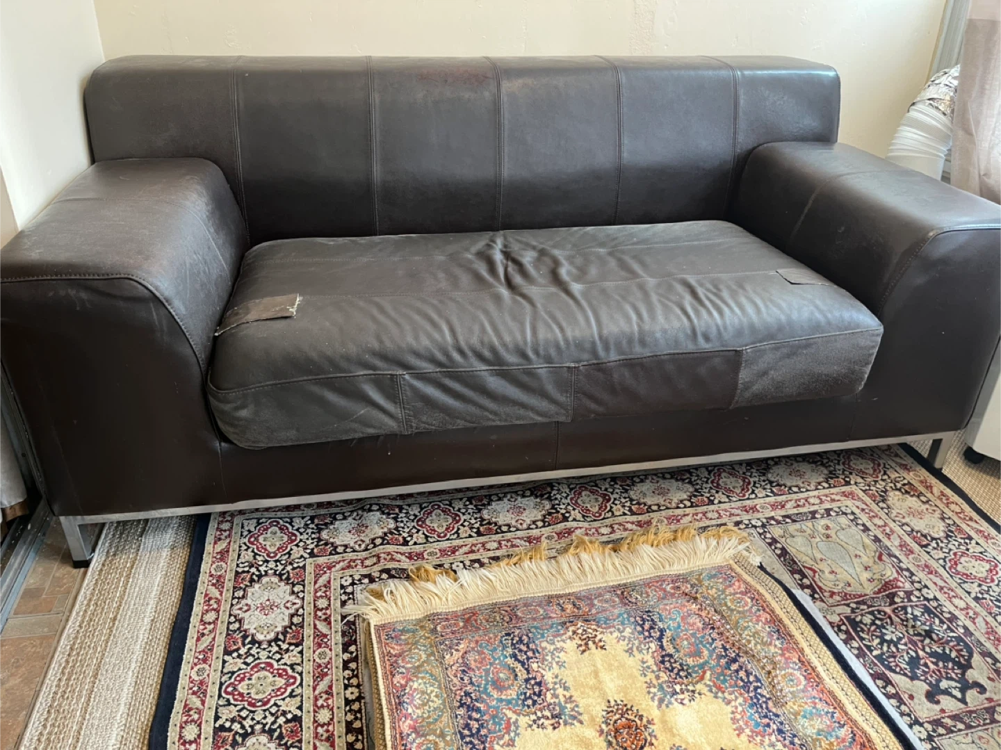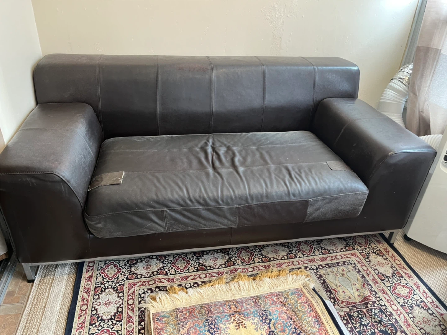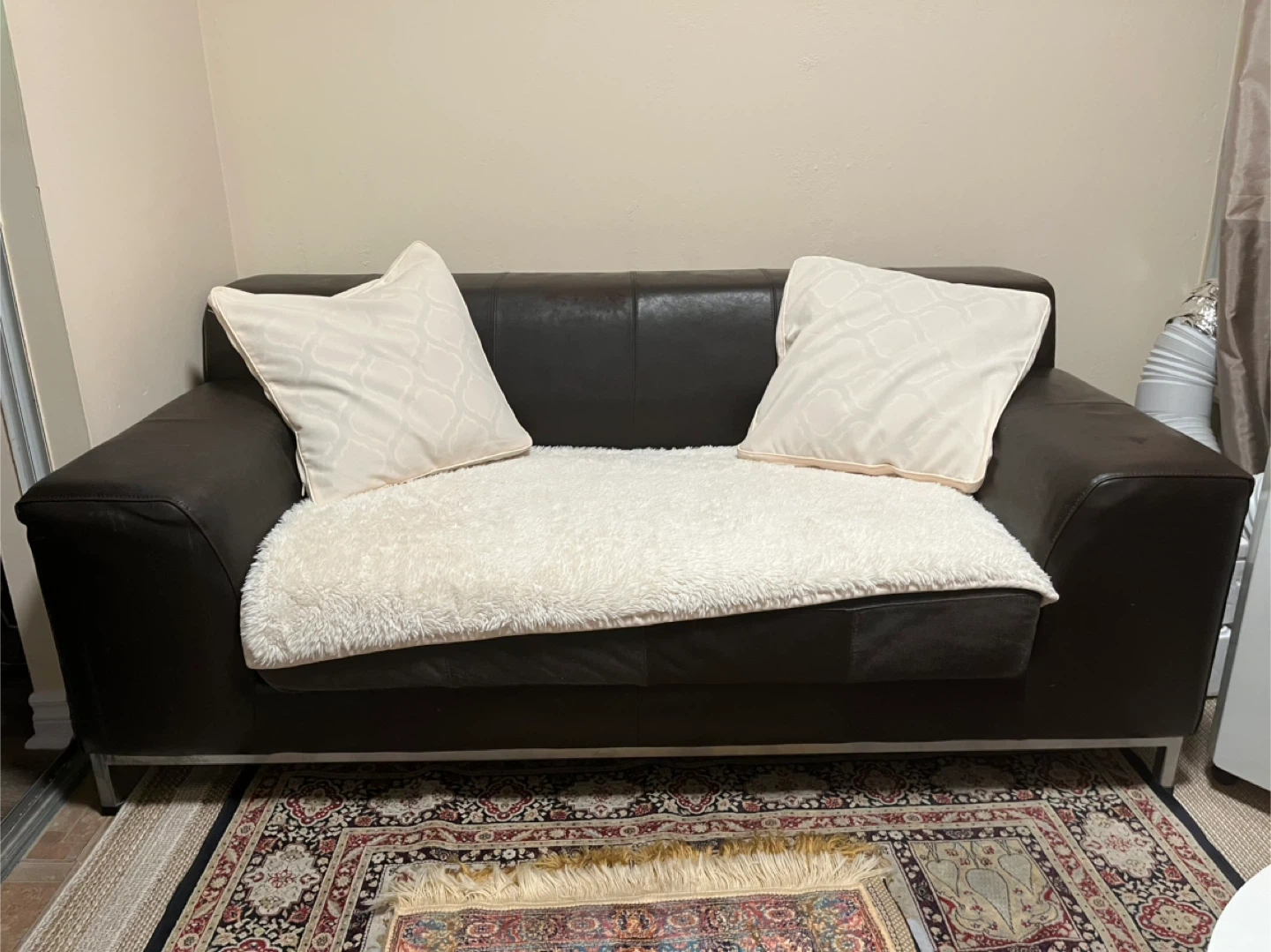 Selling a comfy brown leather sofa! It's in good condition and would be a great addition to any living room or den. It comes with two decorative pillows and a fluffy white throw blanket. Serious inquiries only