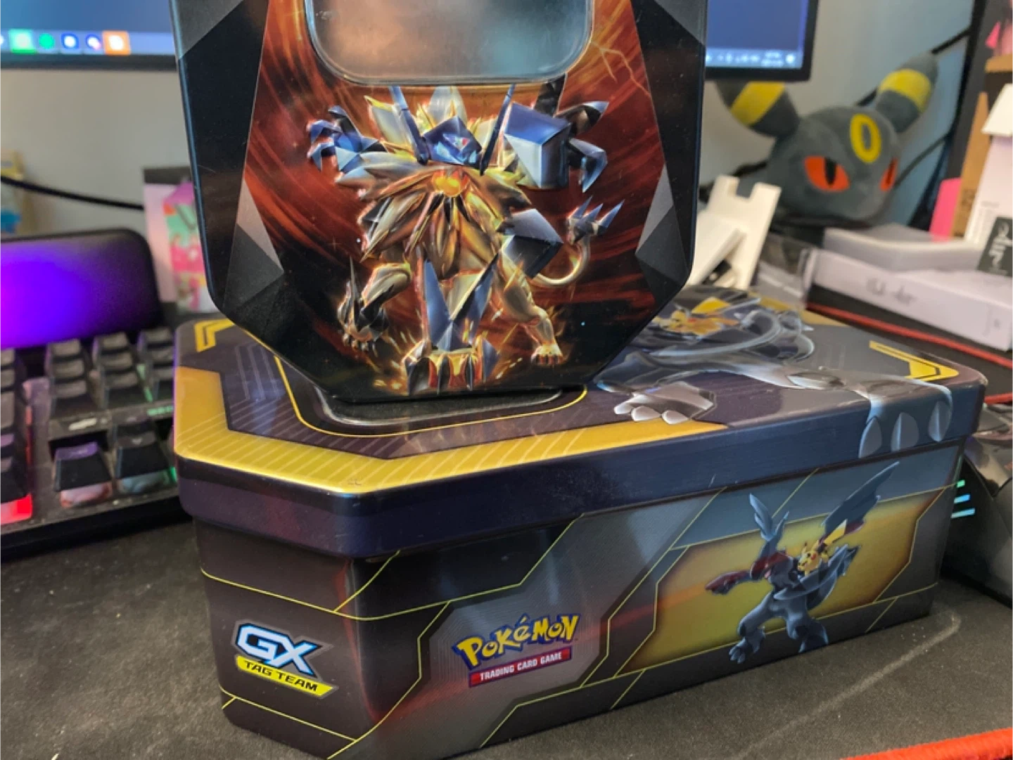 Selling two Pokémon Trading Card Game tins. Great for storing your cards or other small items! One is a GX Tag Team tin, and the other features a Solgaleo and Lunala design