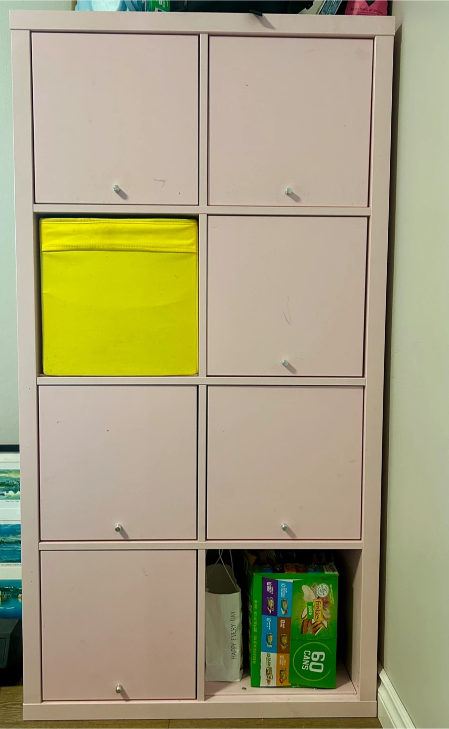 Selling a pink IKEA Kallax shelf unit with 8 doors . It's in great shape and ready for your home! Perfect for organizing books, toys, or anything else you need to store