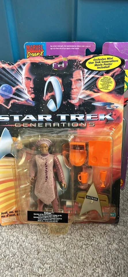This is a Playmates 1994 Star Trek: Generations Guinan action figure. The figure is from the 1994 movie Star Trek Generations. It comes with accessories including a tray, glasses, a Starfleet monitor, and an exclusive mini movie poster.