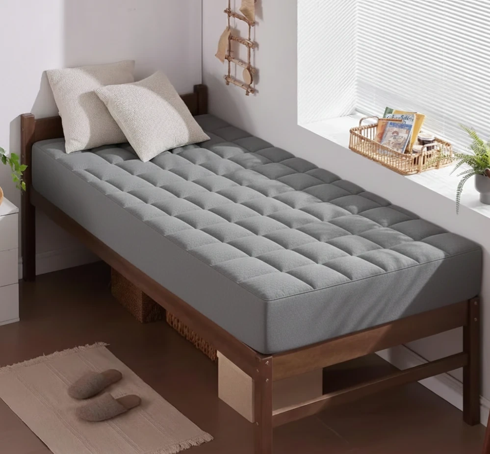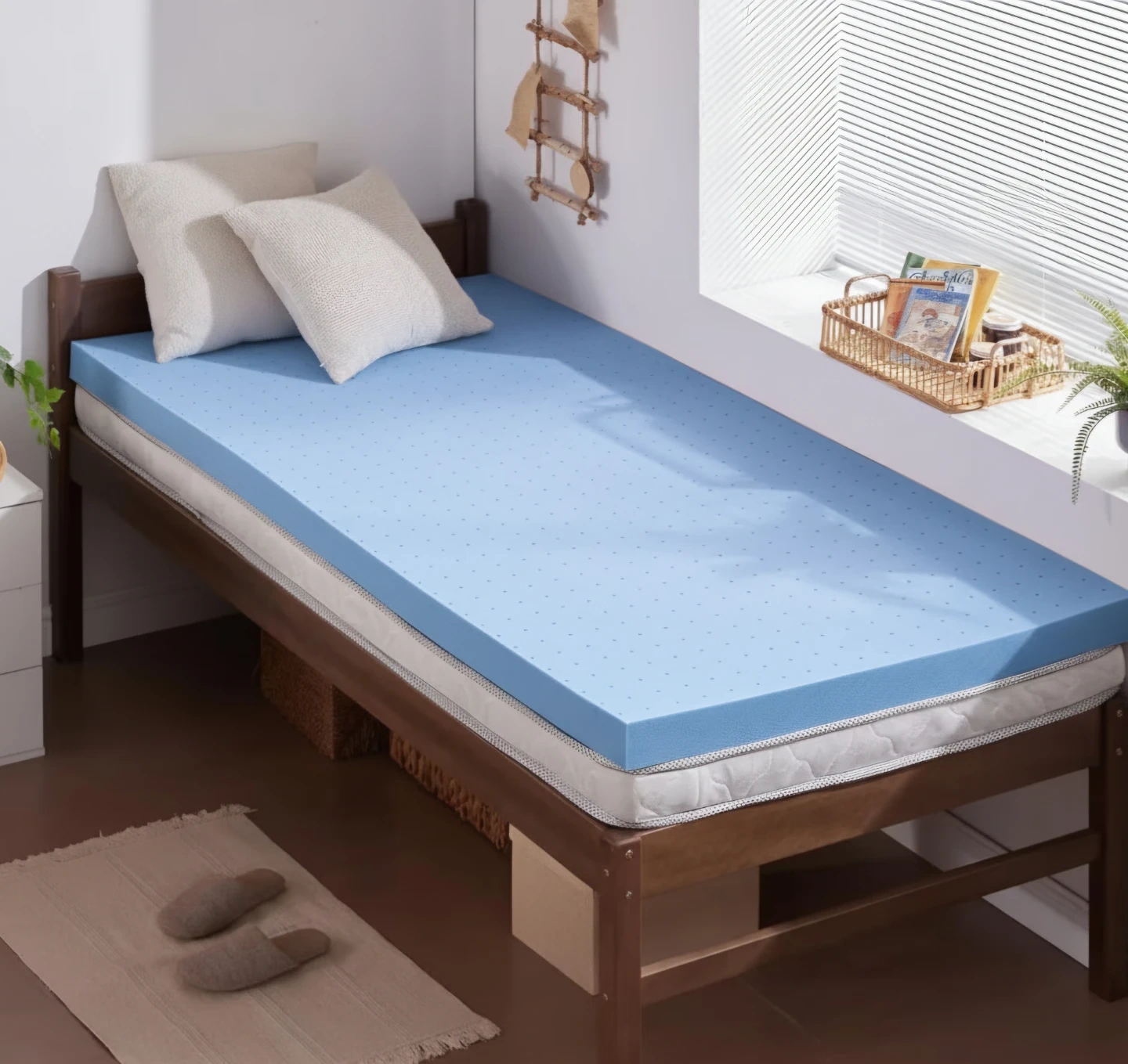 Give your bed a cozy upgrade with this memory foam mattress topper! It's a twin size and ready to add extra comfort to your sleep. The blue topper has a dotted pattern, while the grey one has a quilted design. Perfect for a student dorm or a guest room!