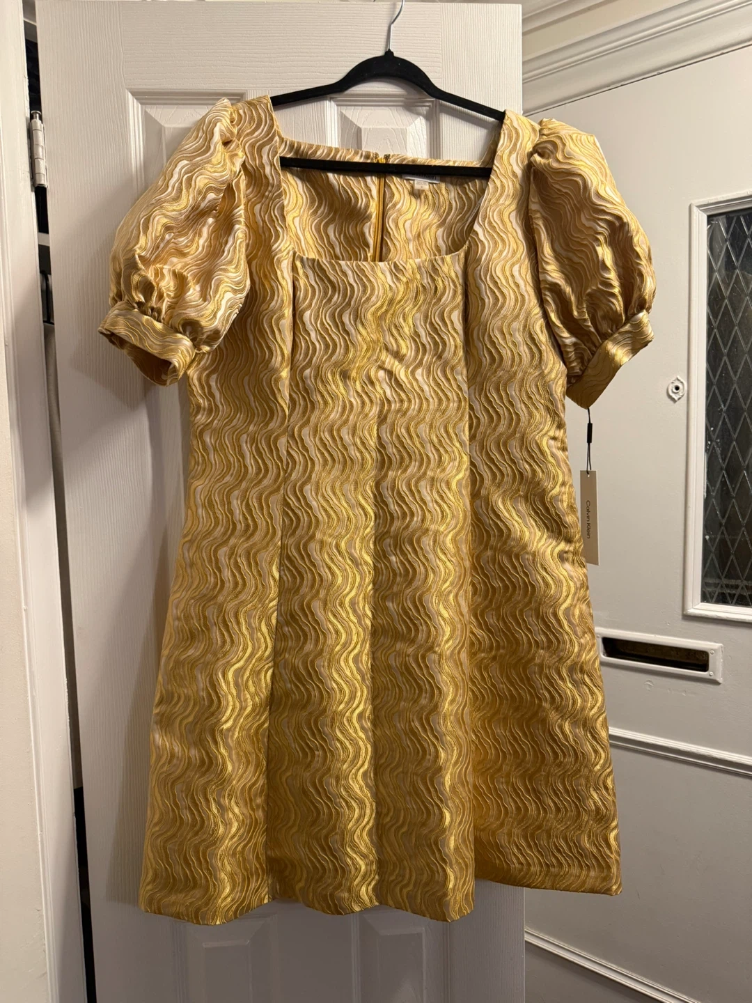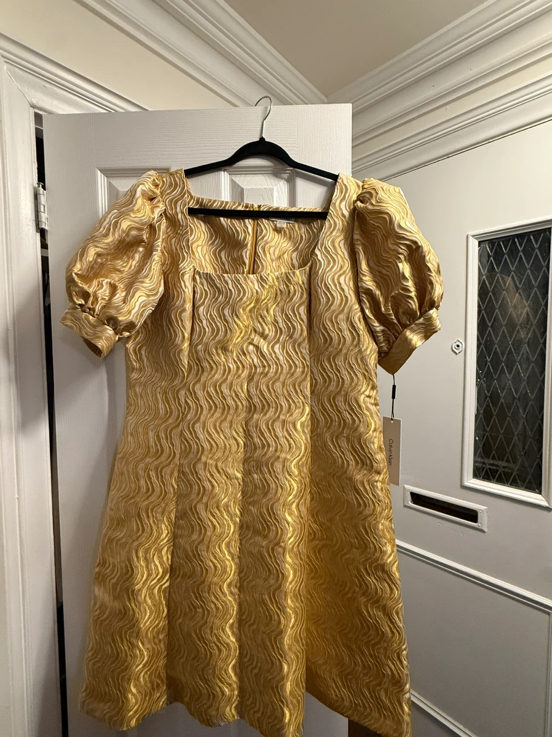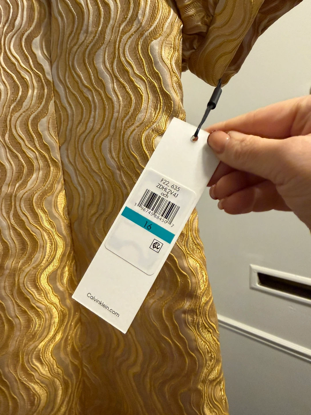 Here's a beautiful gold dress from Calvin Klein in size 16. It has a unique wavy pattern and puff sleeves. Perfect for a special occasion!