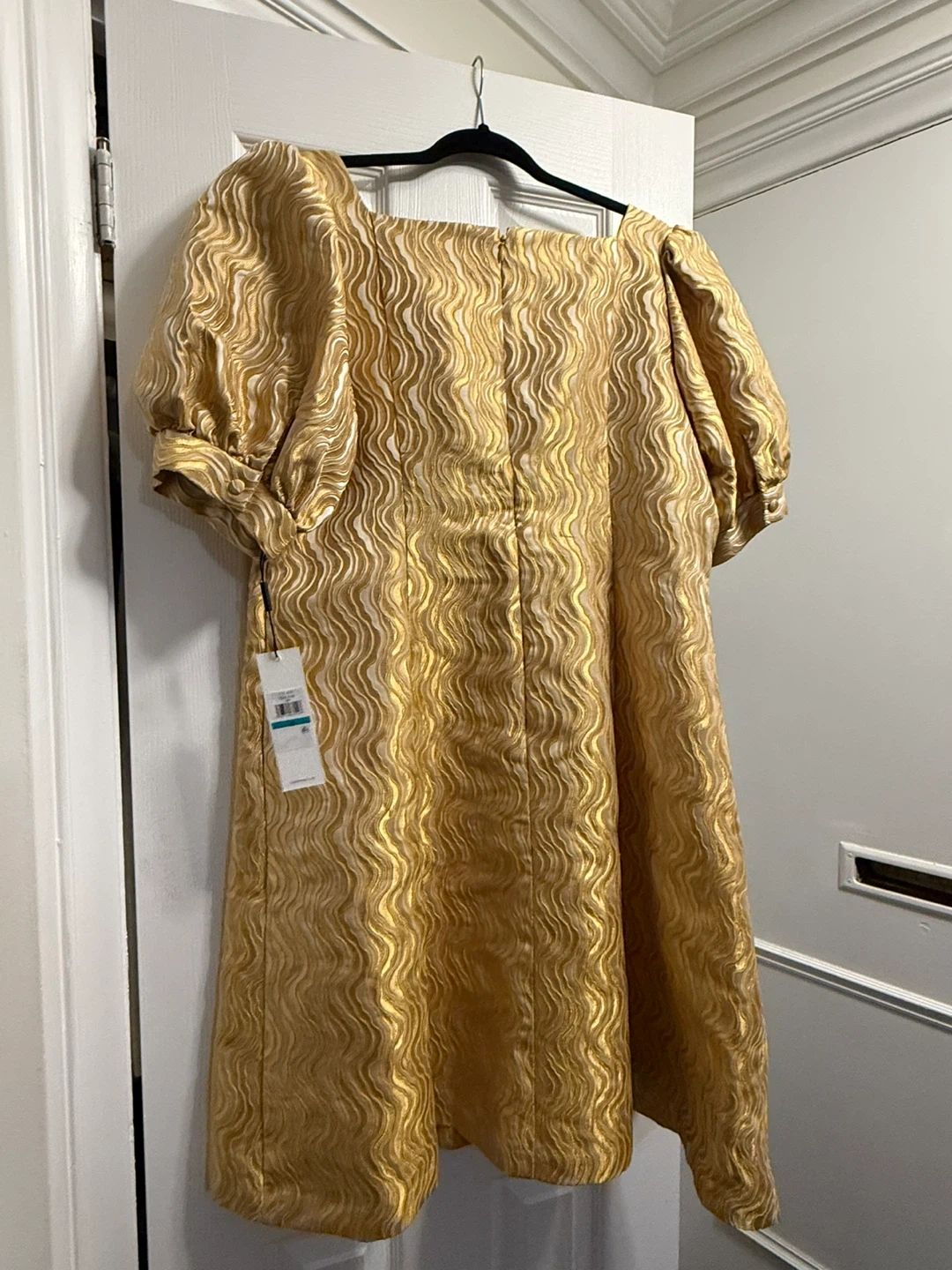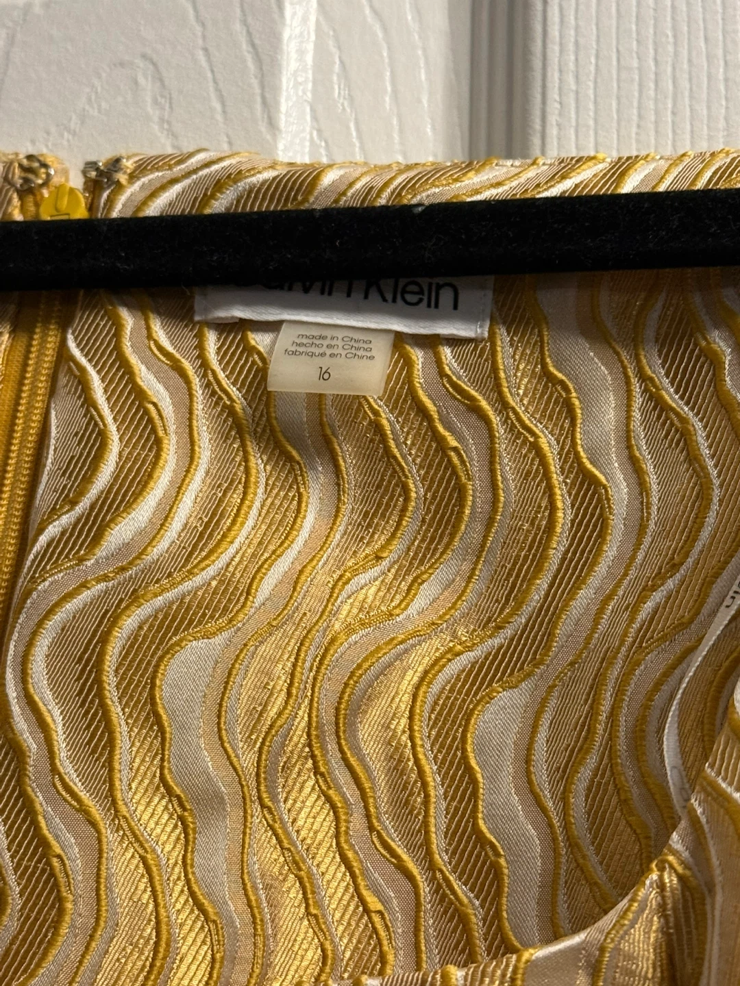 Here's a beautiful gold dress from Calvin Klein in size 16. It has a unique wavy pattern and puff sleeves. Perfect for a special occasion!