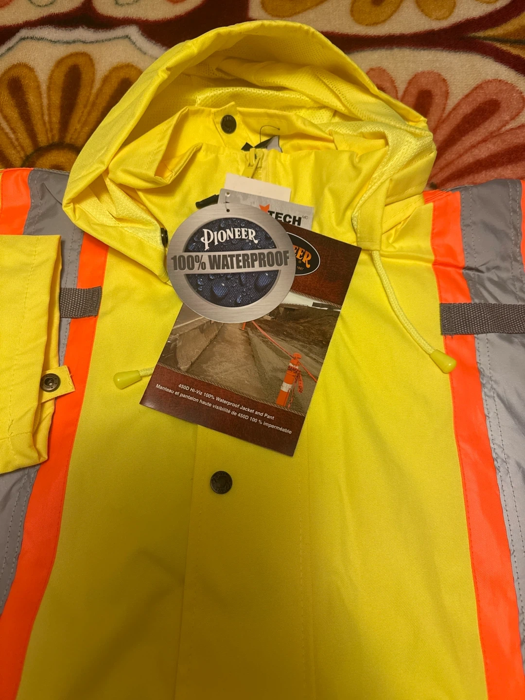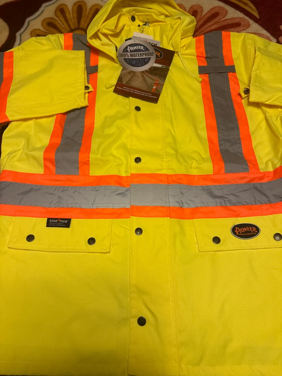 Selling a brand new Pioneer Hi-Vis Waterproof Jacket. This jacket is 100% waterproof and designed for high visibility. It's perfect for staying safe and dry in various weather conditions!