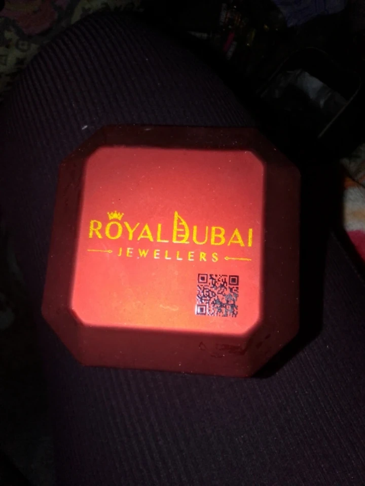 Selling a Royal Dubai Jewellers ring box. It's a red box with gold trim and a black velvet interior. Perfect for storing or gifting a ring!