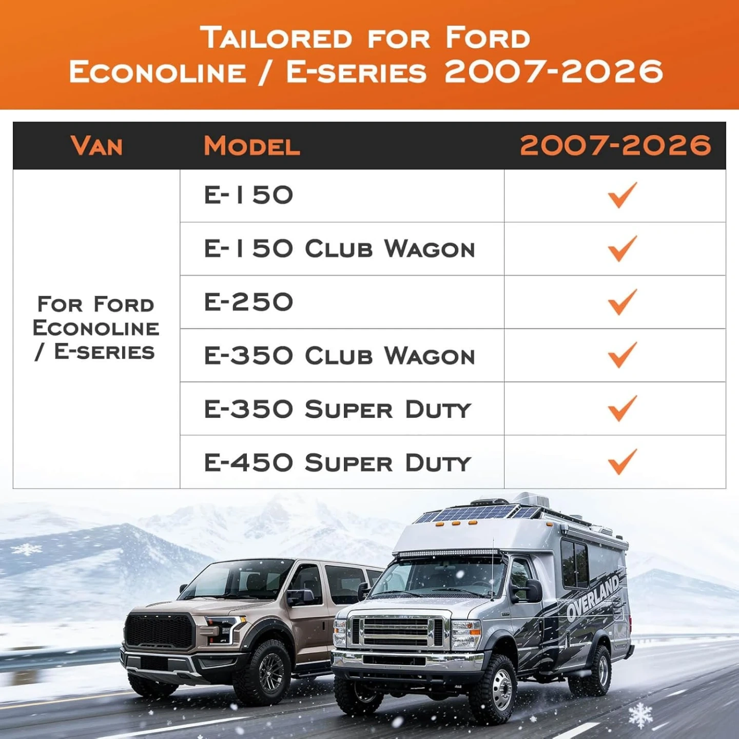 Custom Fit for Ford Econoline/E-Series 2007-2026: Designed specifically for Ford E-Series (Econoline) E150 E250 E350 E450 2007 2008 2009 2010 2011 2012 2013 2014 2015 2016 2017 2018 2019 2020 2021 2022 2023 2024 2025 2026 models. This front car floor mat are custom fit for Ford Van RV E-150, E-150 Club Wagon, E-250, E-350 Club Wagon, E-350 Super Duty, and E-350 Super Duty models