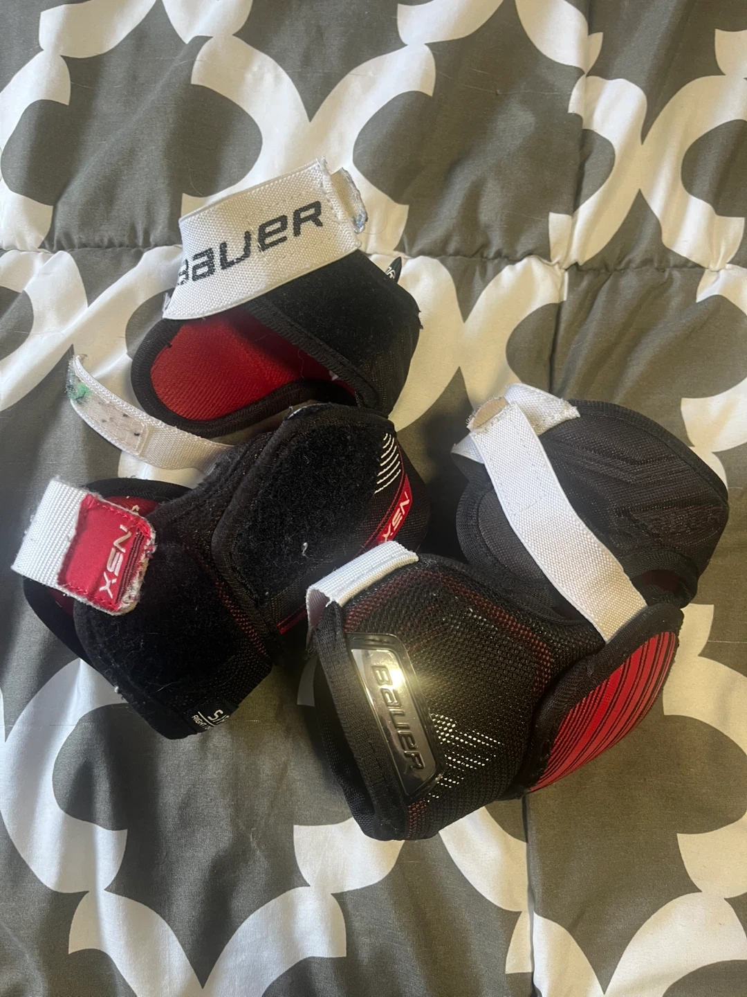 Selling a pair of Bauer NSX hockey elbow pads in size Junior small. They're black and red and in good condition for protecting those elbows on the ice!