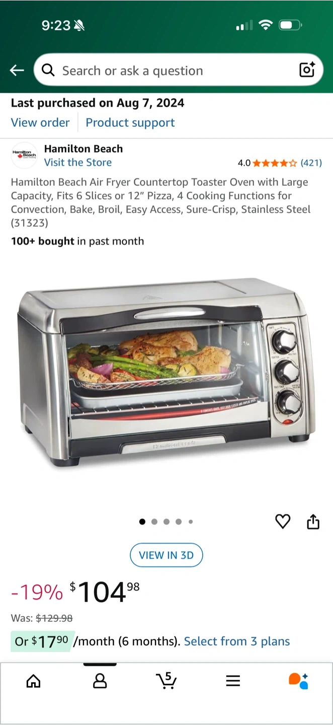 Selling a Hamilton Beach air fryer countertop toaster oven! It has a large capacity and fits 6 slices or a 12" pizza. It also has 4 cooking functions for convection, bake, broil, and easy access. It also features Sure-Crisp technology and is made of stainless.