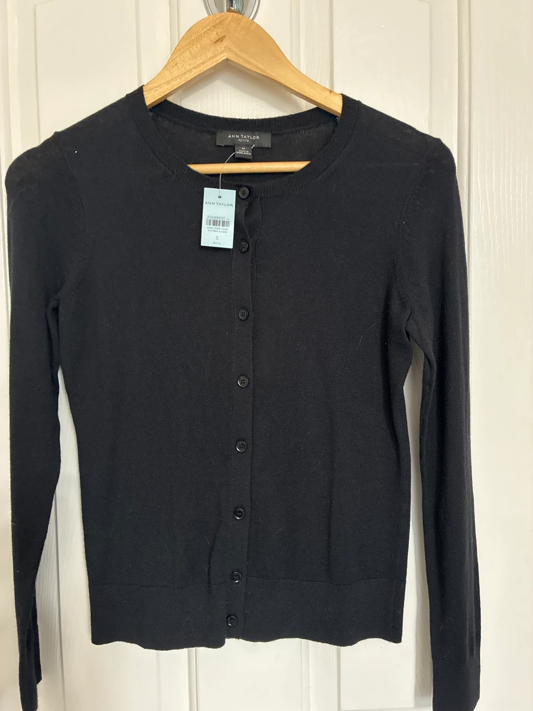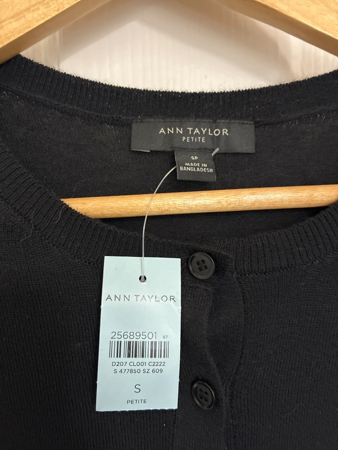This is a brand new Ann Taylor Petite black cardigan in size small! It's a classic piece that would look great with any outfit. Perfect for layering or wearing on its own