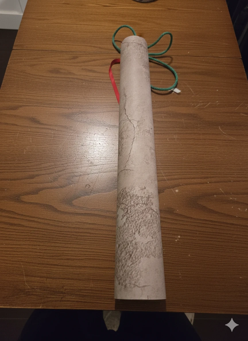 This is a decorative scroll, perfect for adding a touch of character to any room! The scroll has a unique texture and comes with a green and red string for hanging. It's in great condition and ready to be displayed in your home