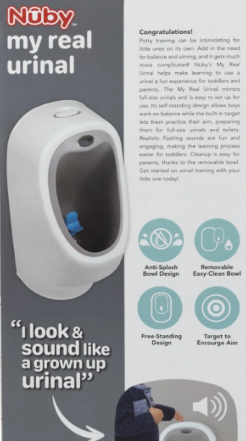 Selling a Nuby My Real Urinal, perfect for potty training your little one! It's designed for ages 18 months and up. The urinal looks and sounds like a grown-up urinal, making the learning process easier and more engaging.