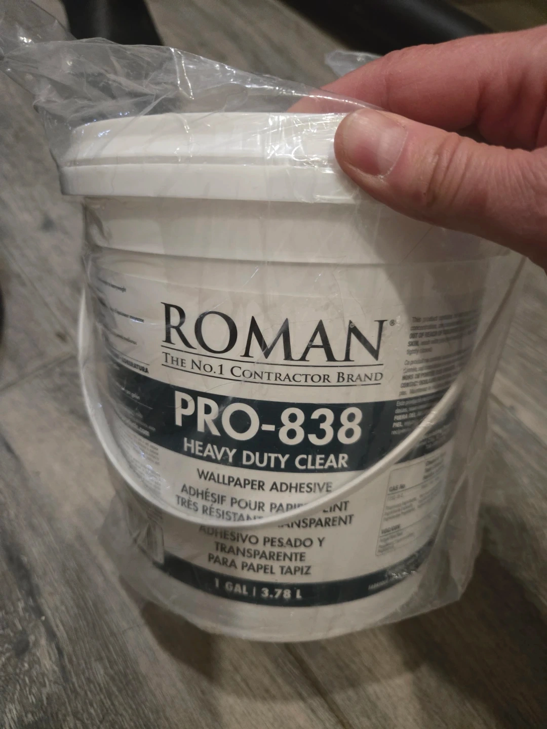 Selling a 1 gallon container of Roman PRO-838 heavy duty clear wallpaper adhesive. It's the No.1 contractor brand, perfect for wallpaper projects! It's a heavy duty clear adhesive that is transparent when applied.