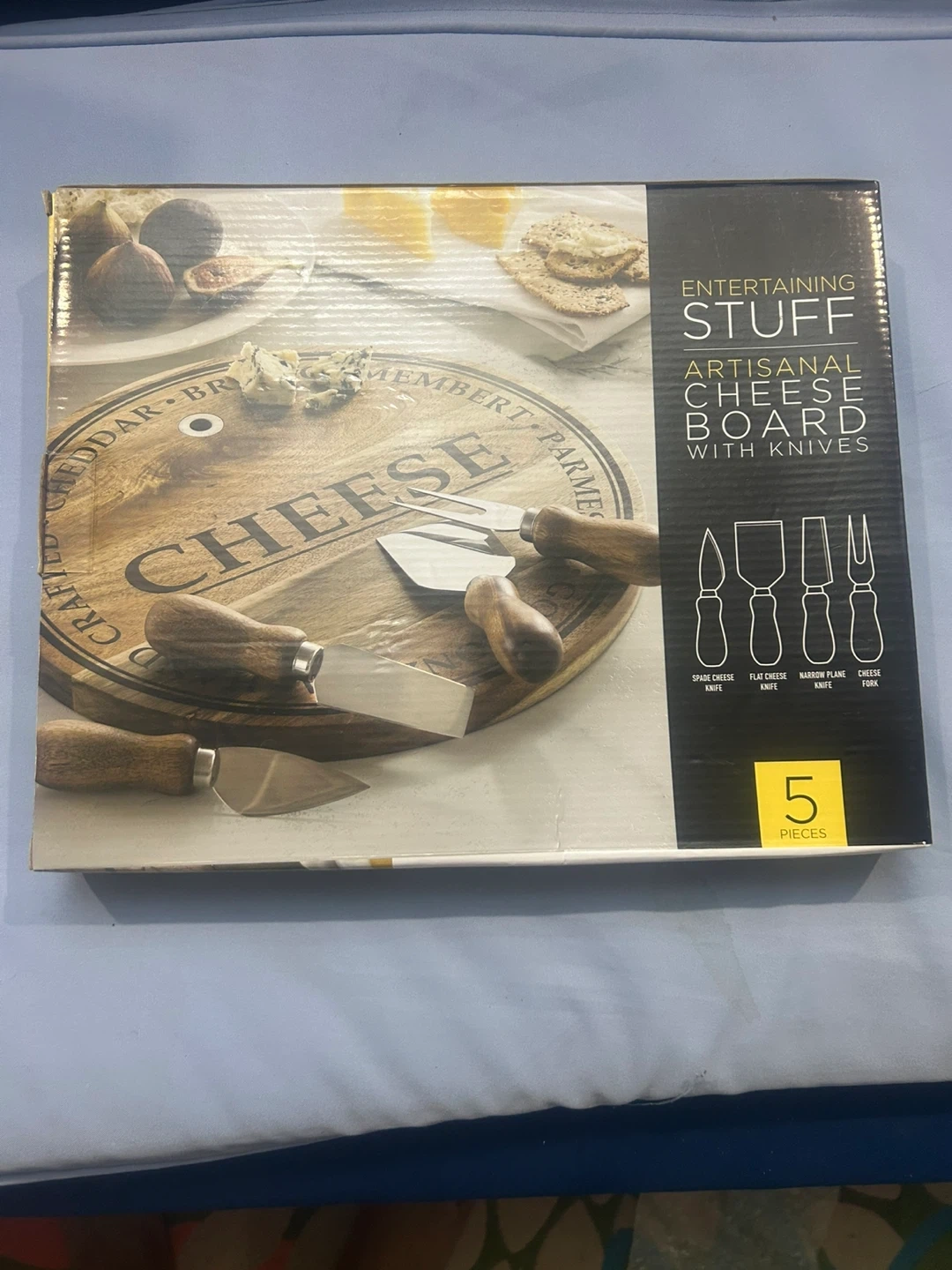 Selling an artisanal cheese board with knives set! The box says it includes 5 pieces. It includes a spade cheese knife, flat cheese knife, narrow plane knife and cheese fork. Great for entertaining or gifting. BRAND NEW!!!!! Cash only Price is firm