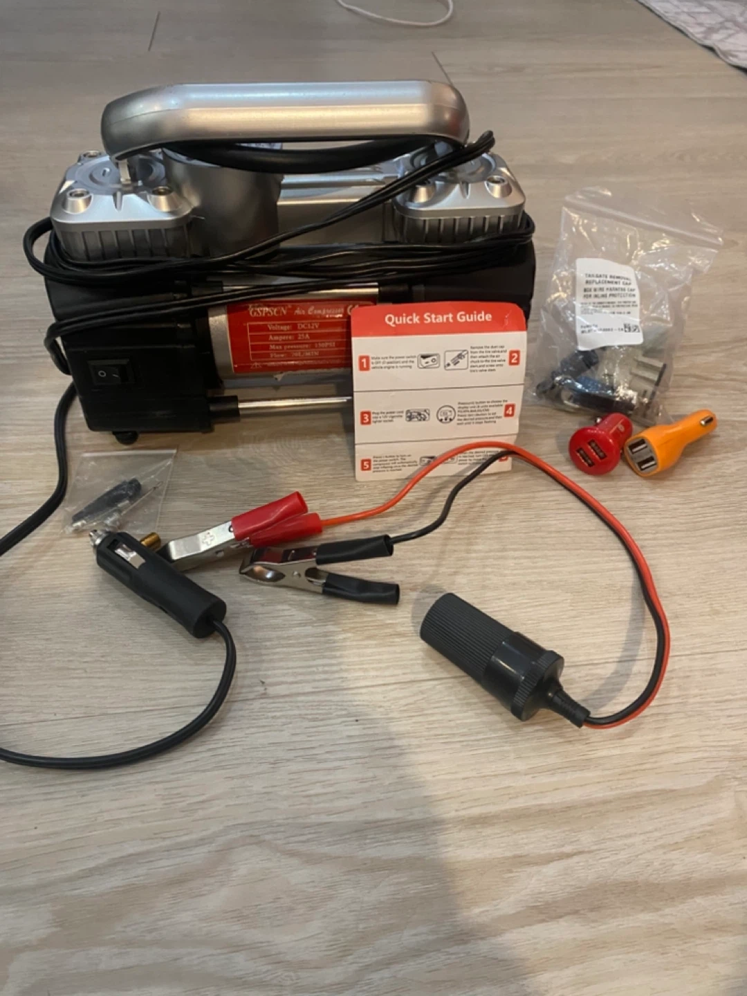 Selling a GSPSCN air compressor with a digital display. It runs on DC 12V and has a maximum pressure of 150 PSI.