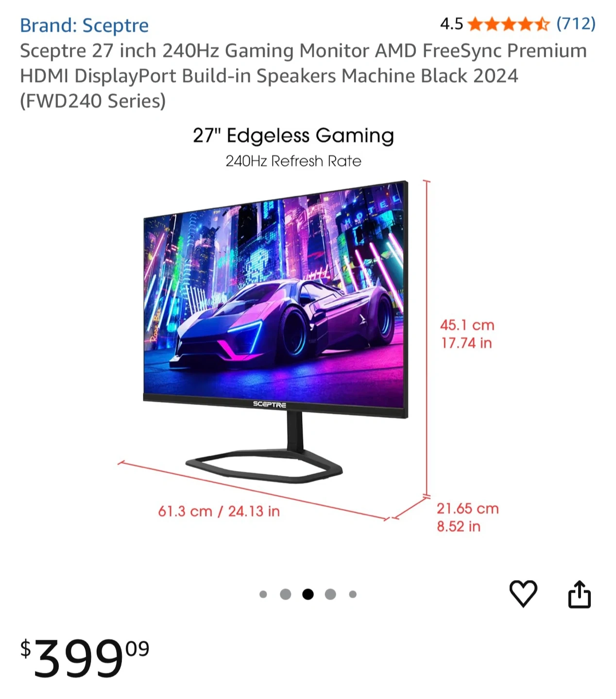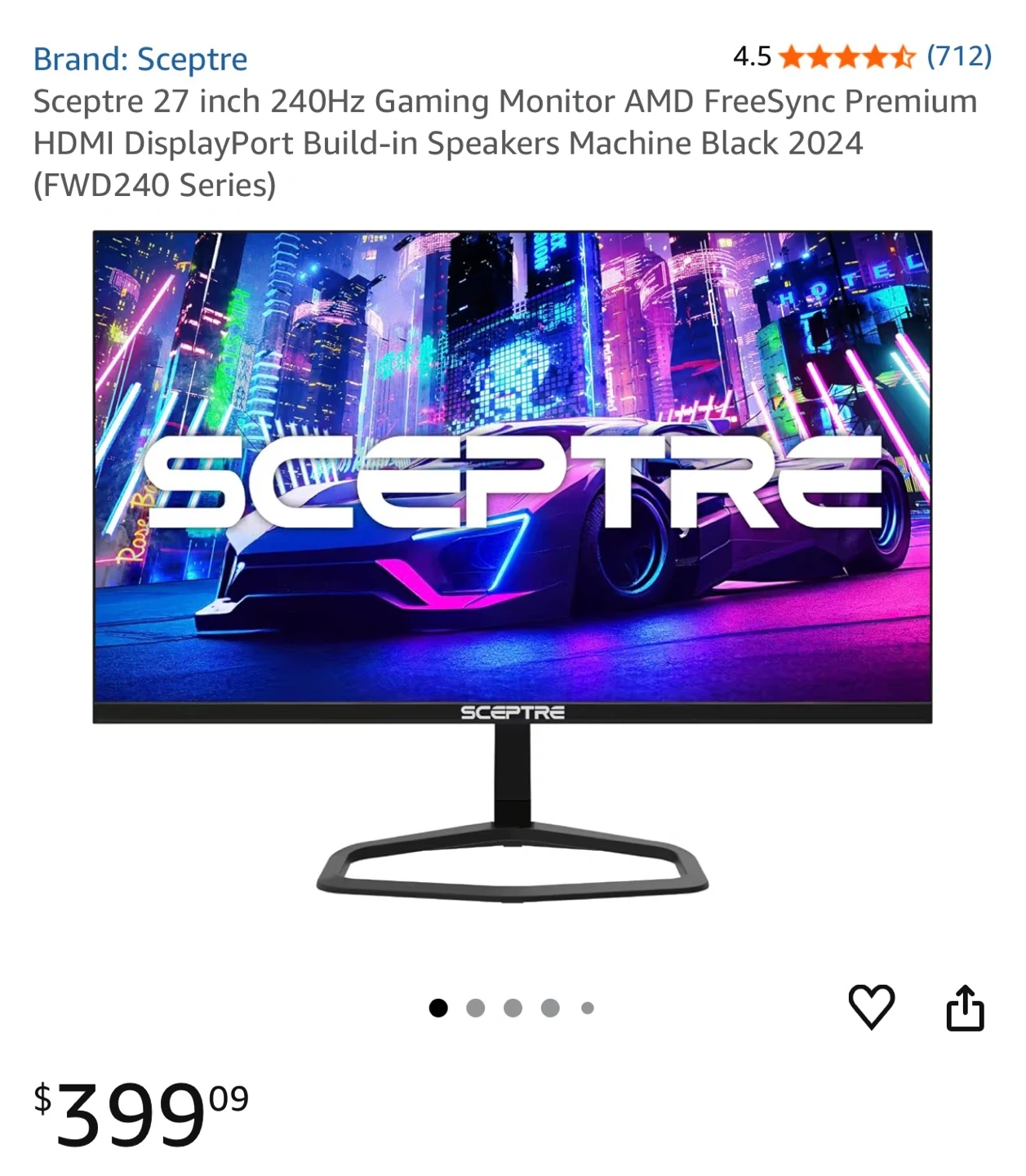 Selling a Sceptre 27-inch 240Hz Gaming Monitor. It's in excellent condition! This monitor features AMD FreeSync Premium, built-in speakers, and a sleek black design (FWD240 Series). Originally bought for $399.09