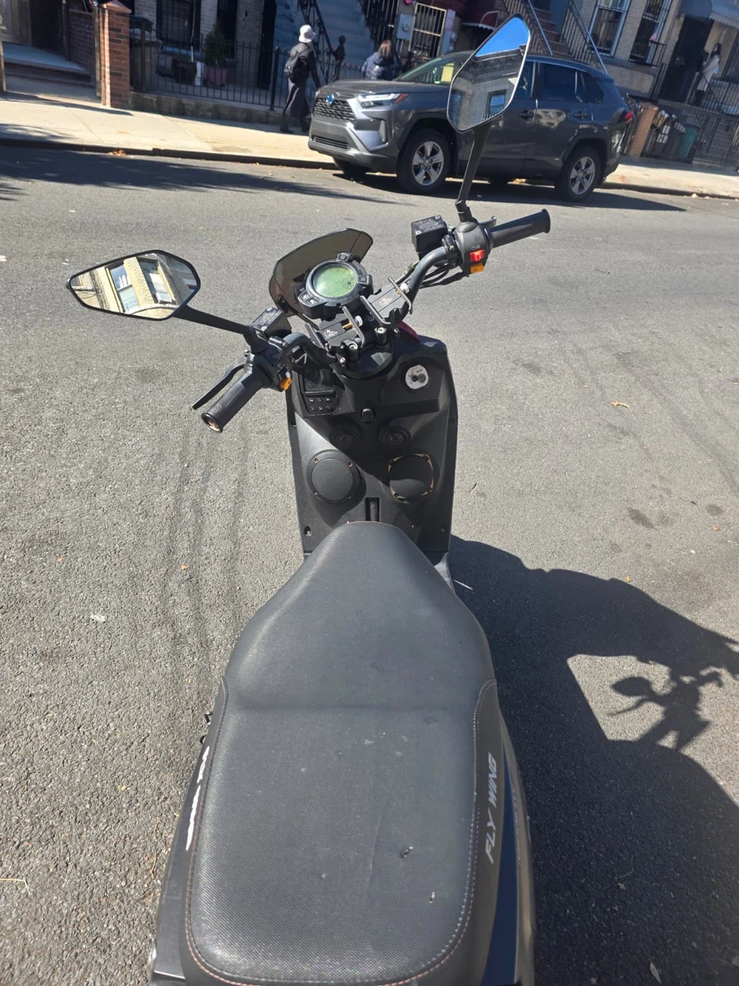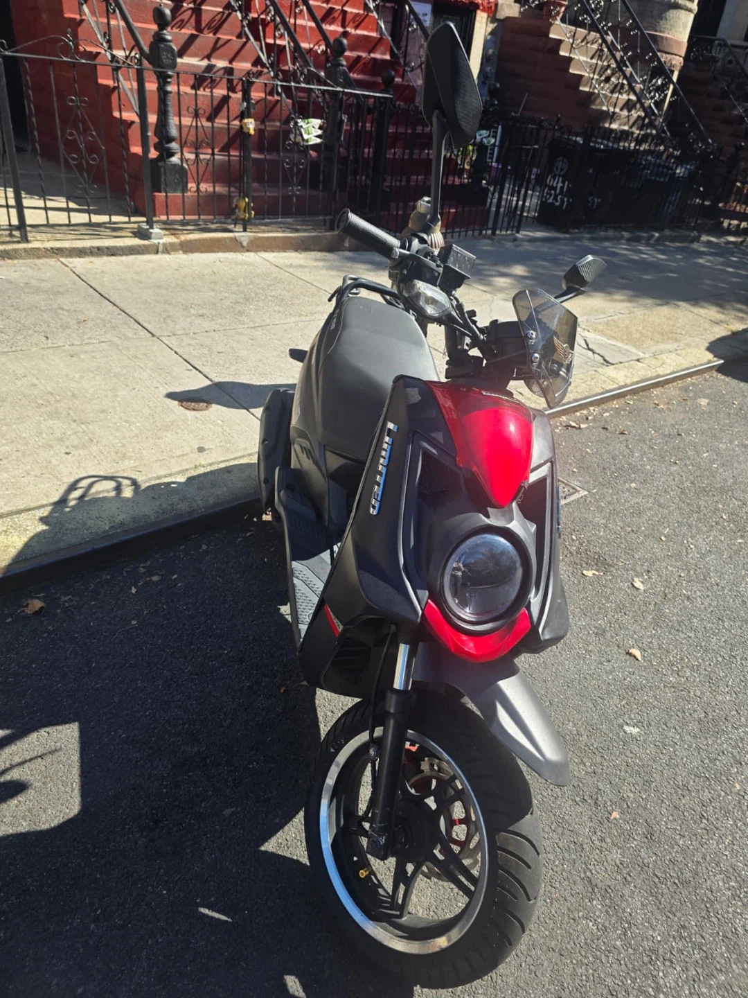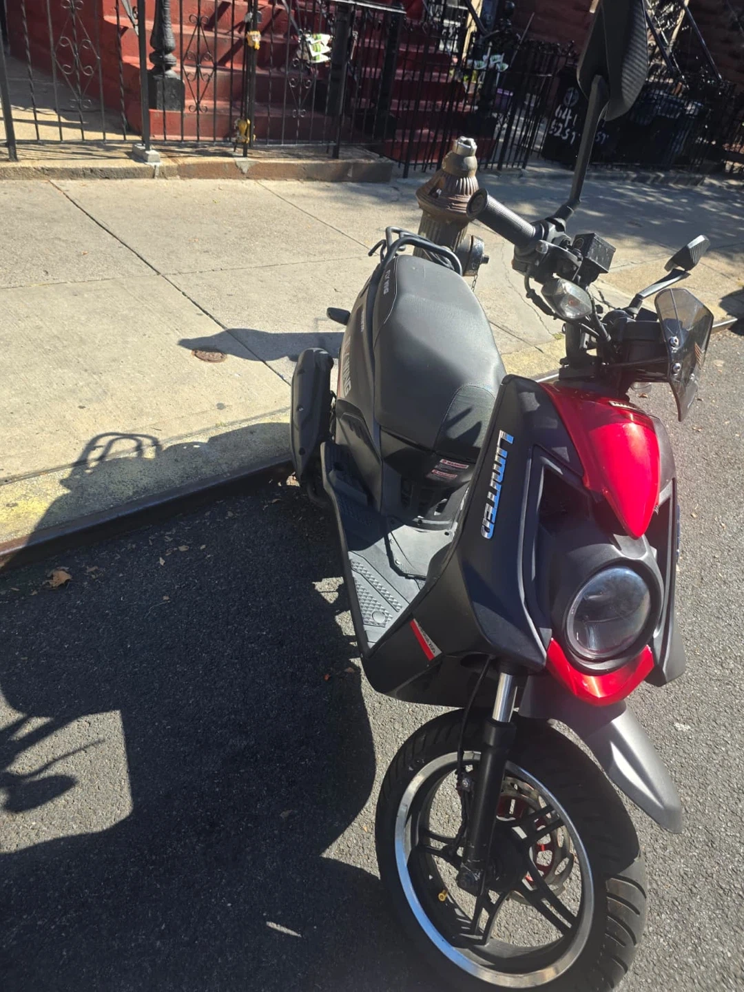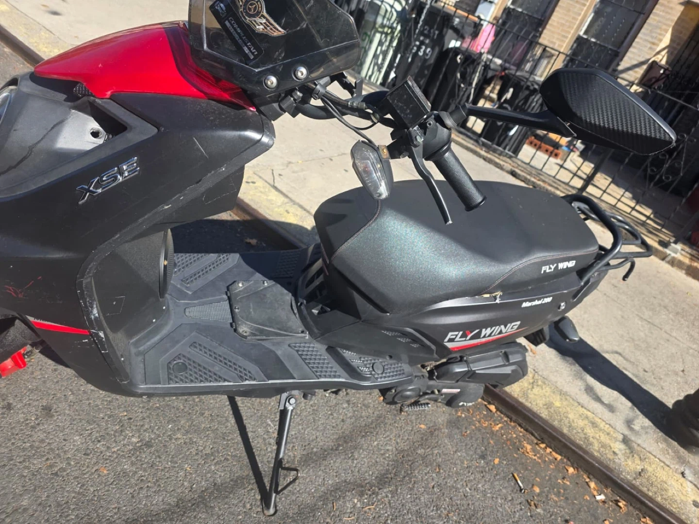 Selling a Fly Wing Marshal 200 electric motorcycle. It's black and red and in good condition. The motorcycle has a seat and mirrors. It is labeled 'Limited'.