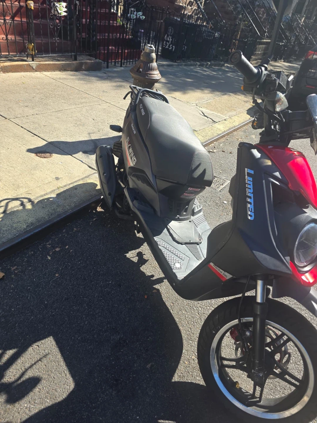 Selling a Fly Wing Marshal 200 electric motorcycle. It's black and red and in good condition. The motorcycle has a seat and mirrors. It is labeled 'Limited'.