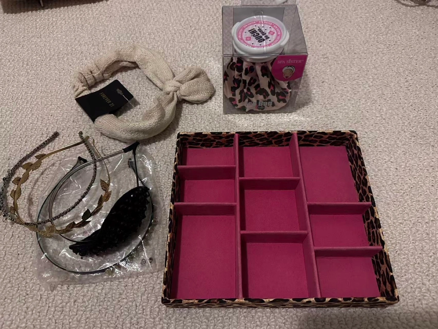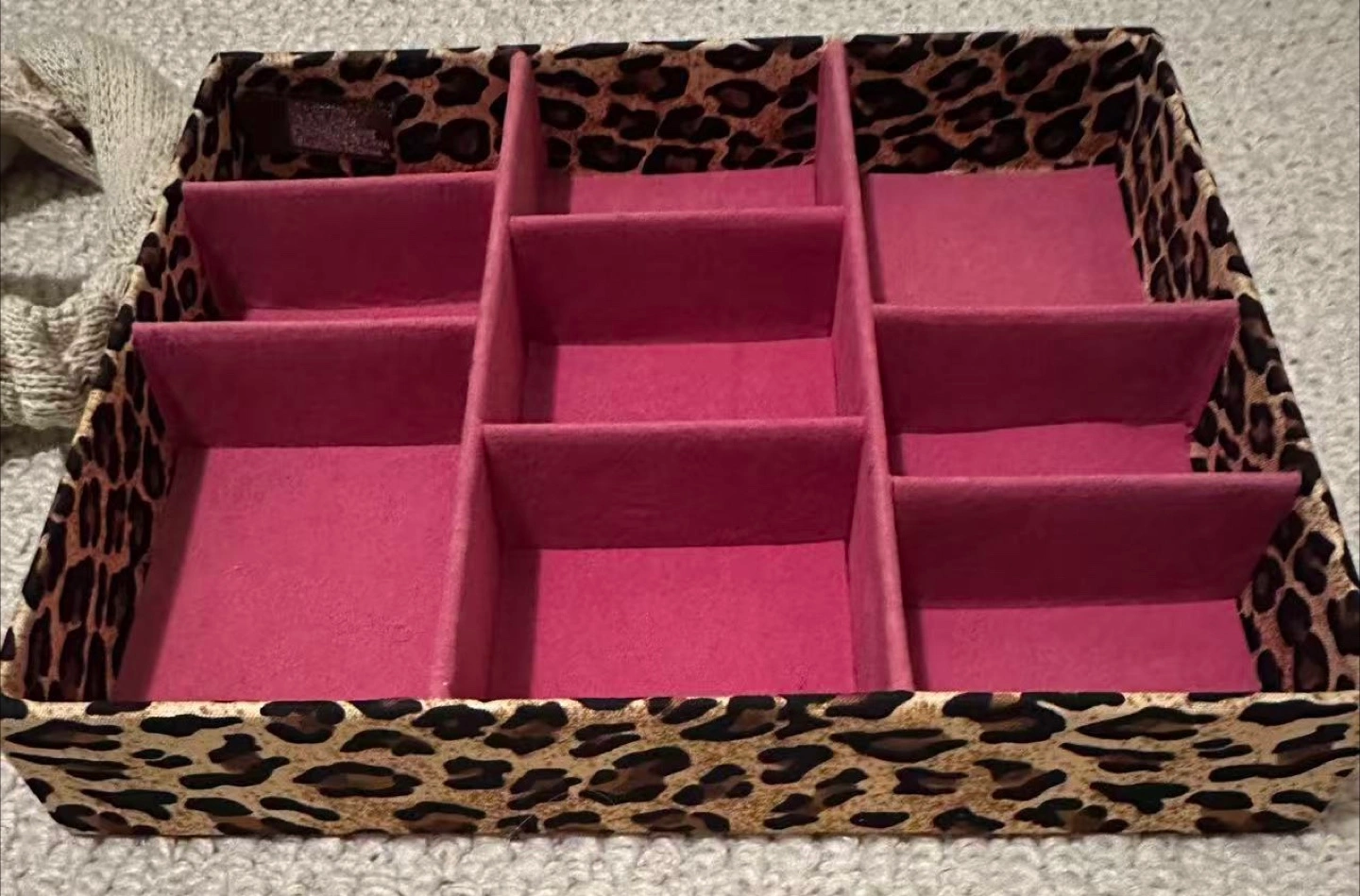 Selling a Raymond Waites organizer box! It features a fun leopard print design on the outside and a pink felt interior with dividers. Perfect for keeping your accessories or small items neatly organized. Plus all accessories in the pictures