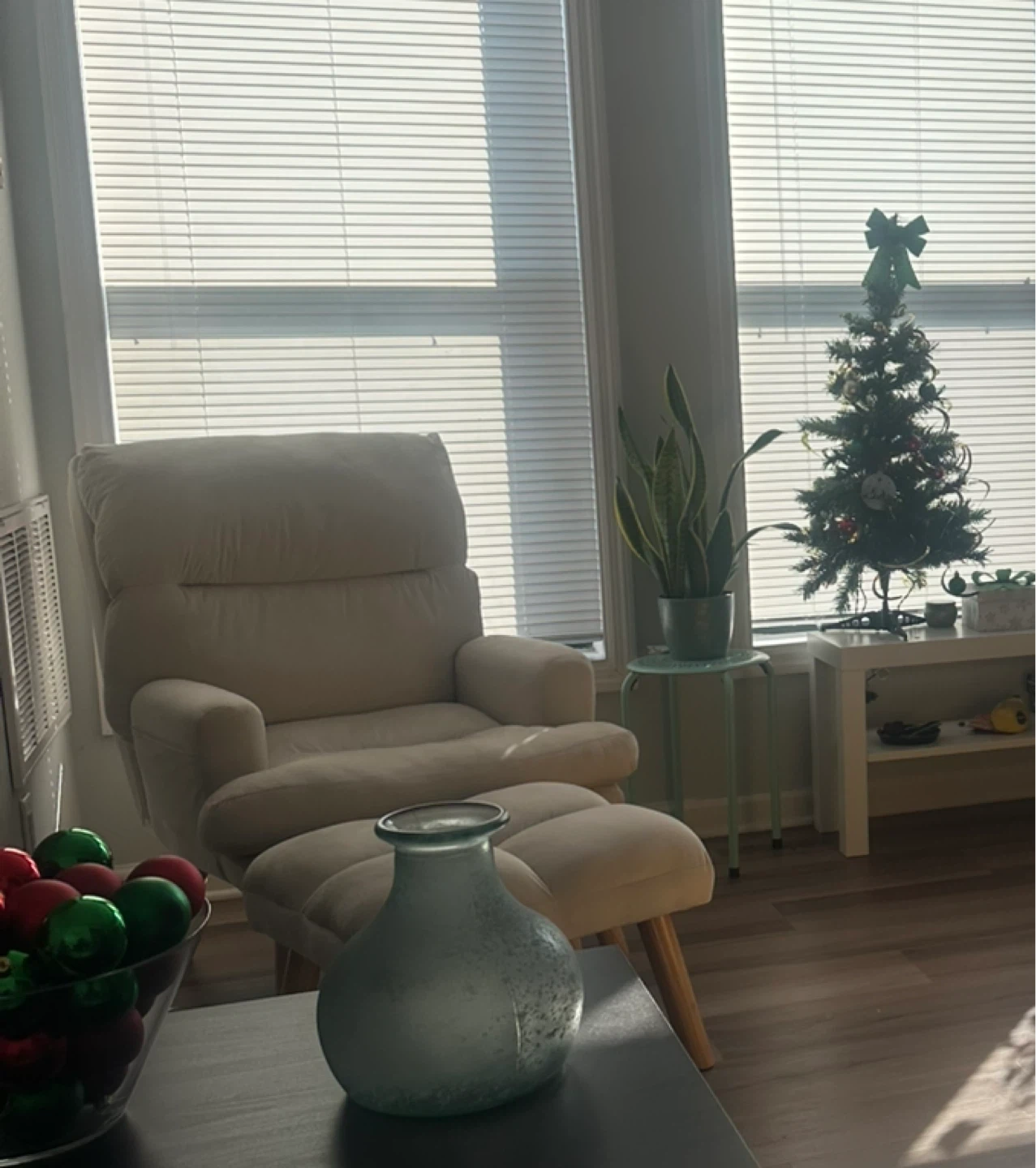 Selling a comfortable beige recliner chair that comes with a matching ottoman. It's in great condition and would be a perfect addition to any living room or bedroom. The chair is super comfy for relaxing and watching TV!