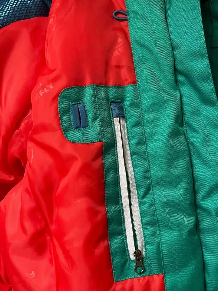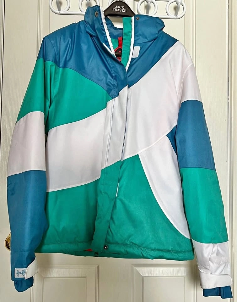 Woman's Ski Jacket fits Large. Has lost of pockets, and a detatchable hood. Sleeve is 19.5" from underarm. Other measurement in picture selection. Additional $35 for ski pants when purchased together with jacket.