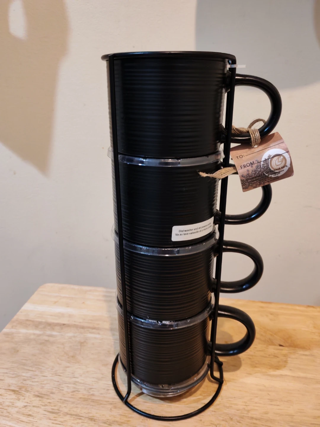 Keep your mugs organized with this sleek black mug stack and stand! It holds up to four mugs, saving space in your kitchen. The stand is sturdy and the mugs are easy to access. Perfect for coffee or tea lovers!