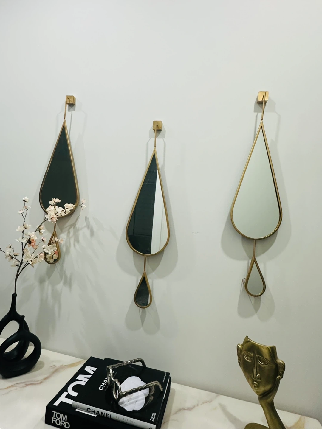 Add a touch of elegance to your space with this set of three teardrop-shaped wall mirrors! These stylish mirrors are perfect for adding visual interest and creating a focal point in any room. They're in great condition and ready to brighten up your home