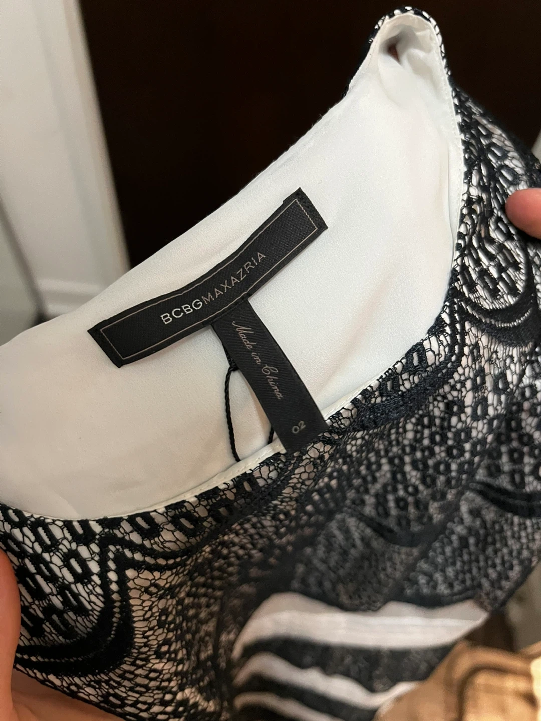 Selling a lovely BCBGMAXAZRIA dress in size 02. It features a beautiful black lace pattern over a white lining. Perfect for a special occasion!