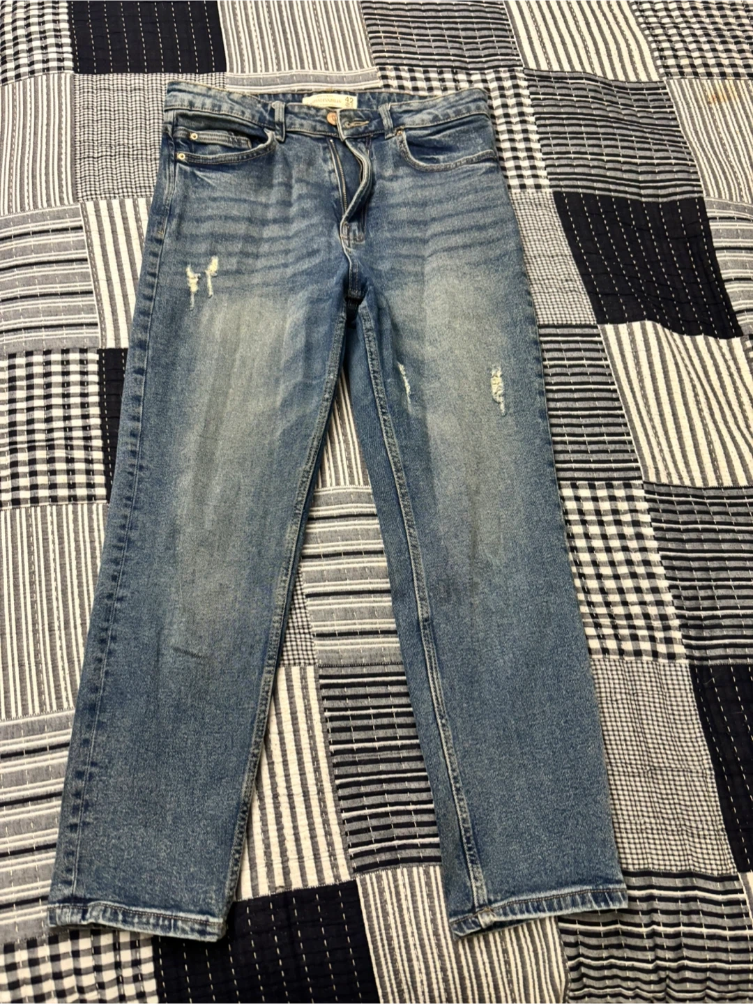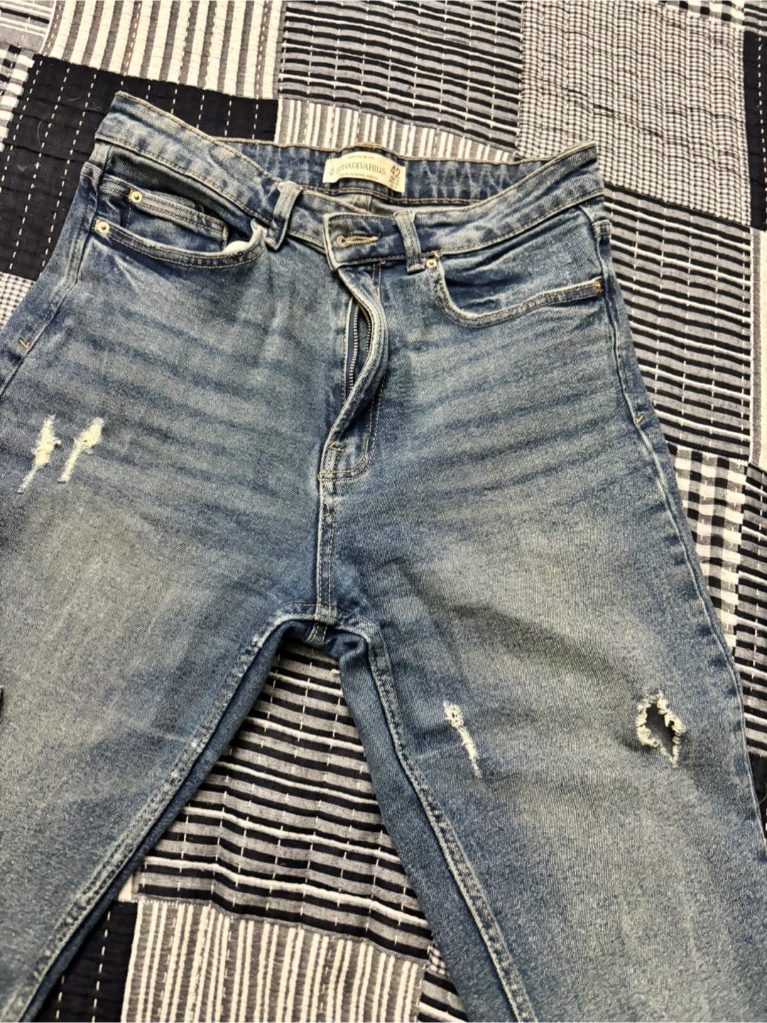 Selling a pair of Stradivarius jeans with a stylish distressed look! They're in good condition and ready for a new home. Perfect for casual outings or adding a bit of edge to your everyday style