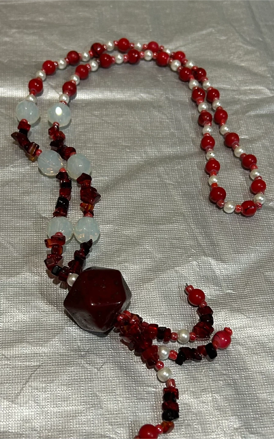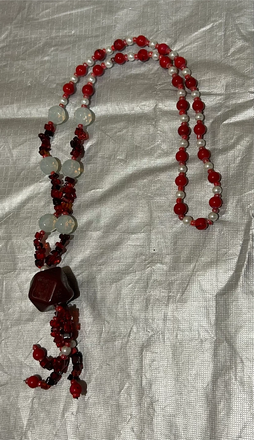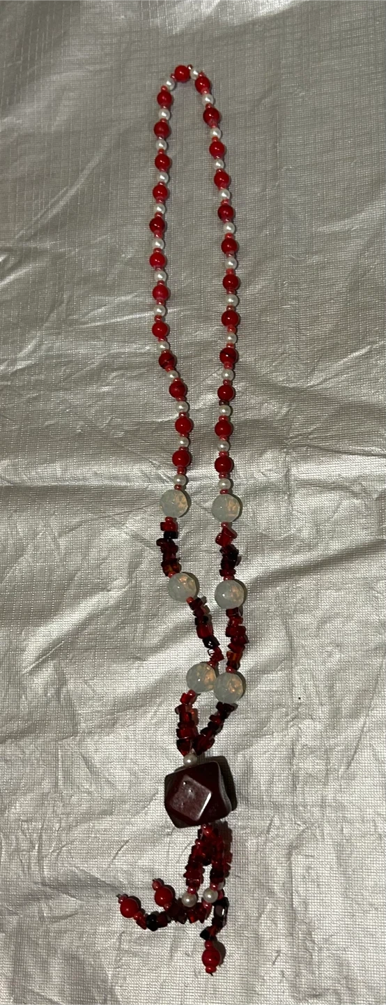 Selling a unique red and white beaded necklace! It features a mix of red and white beads, and a large, eye-catching pendant. Perfect for adding a pop of colour to any outfit!