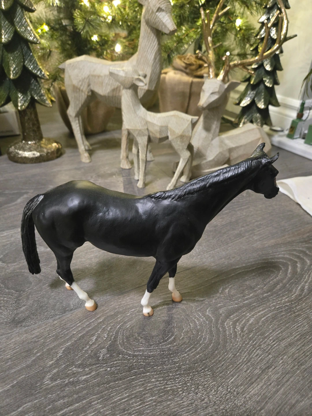 Here's a Breyer horse figurine! It's a beautiful black colour with white markings on the face and legs. It would make a great addition to any collection or a fun toy for a horse lover.