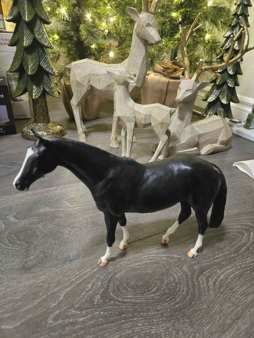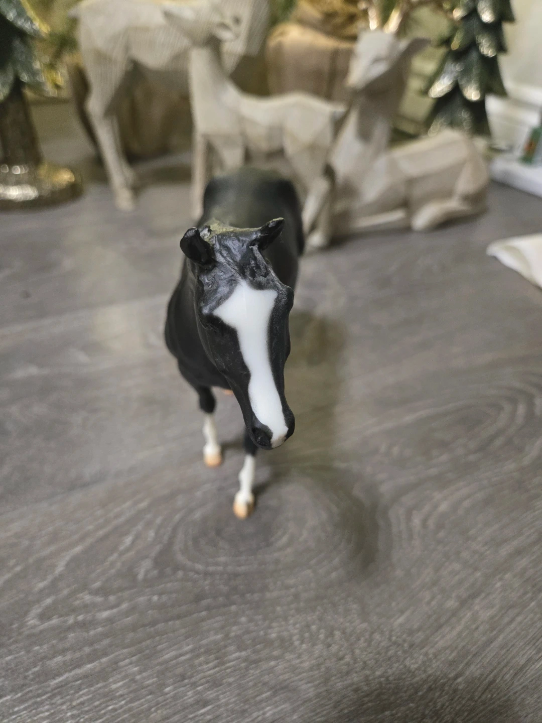 Here's a Breyer horse figurine! It's a beautiful black colour with white markings on the face and legs. It would make a great addition to any collection or a fun toy for a horse lover.