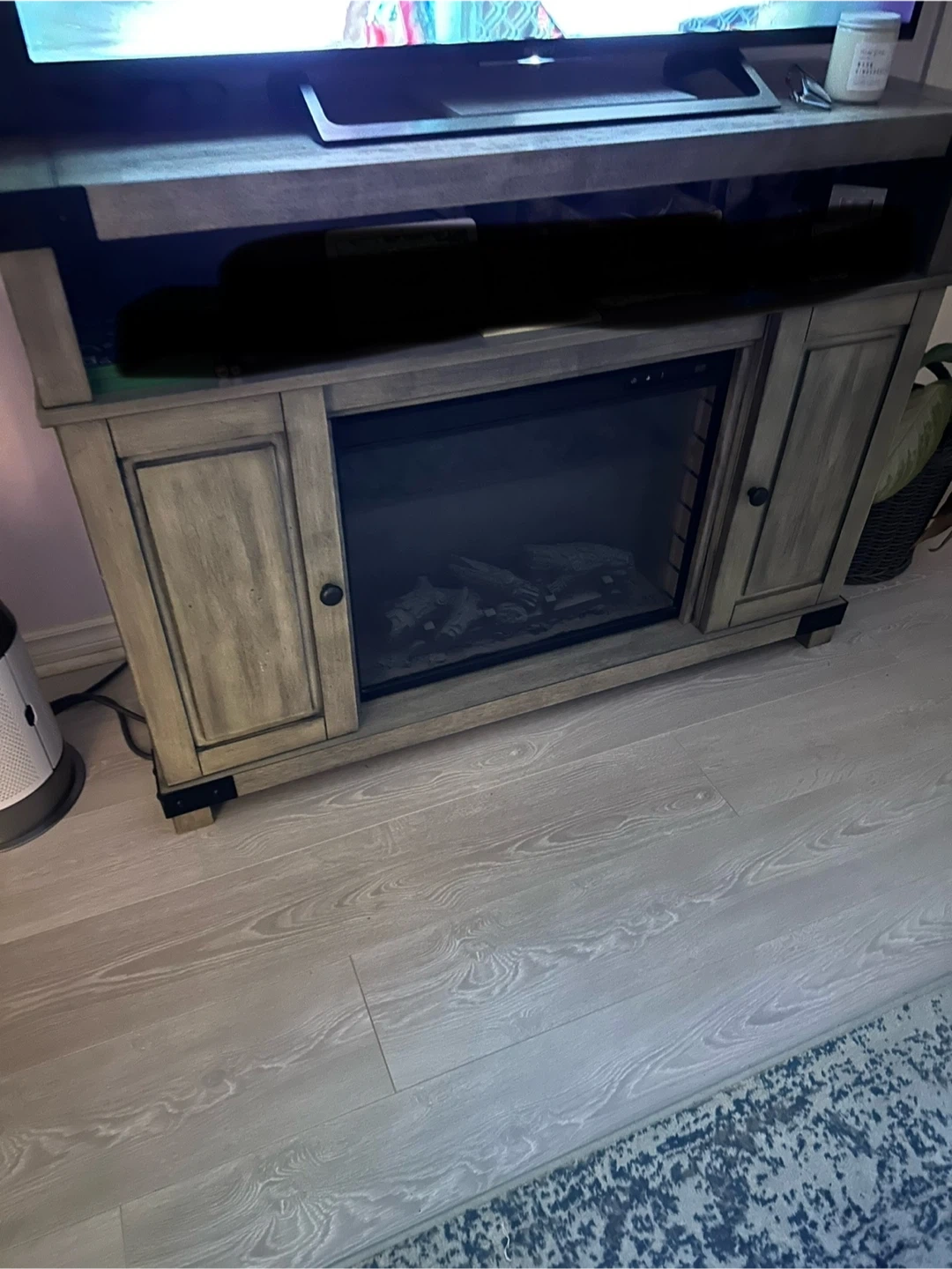 Selling a fireplace TV stand! It's in great condition. 2 cabinet doors with storage plus a spacious shelf. All you need is a new insert as heat no longer works but the flames still turn on.