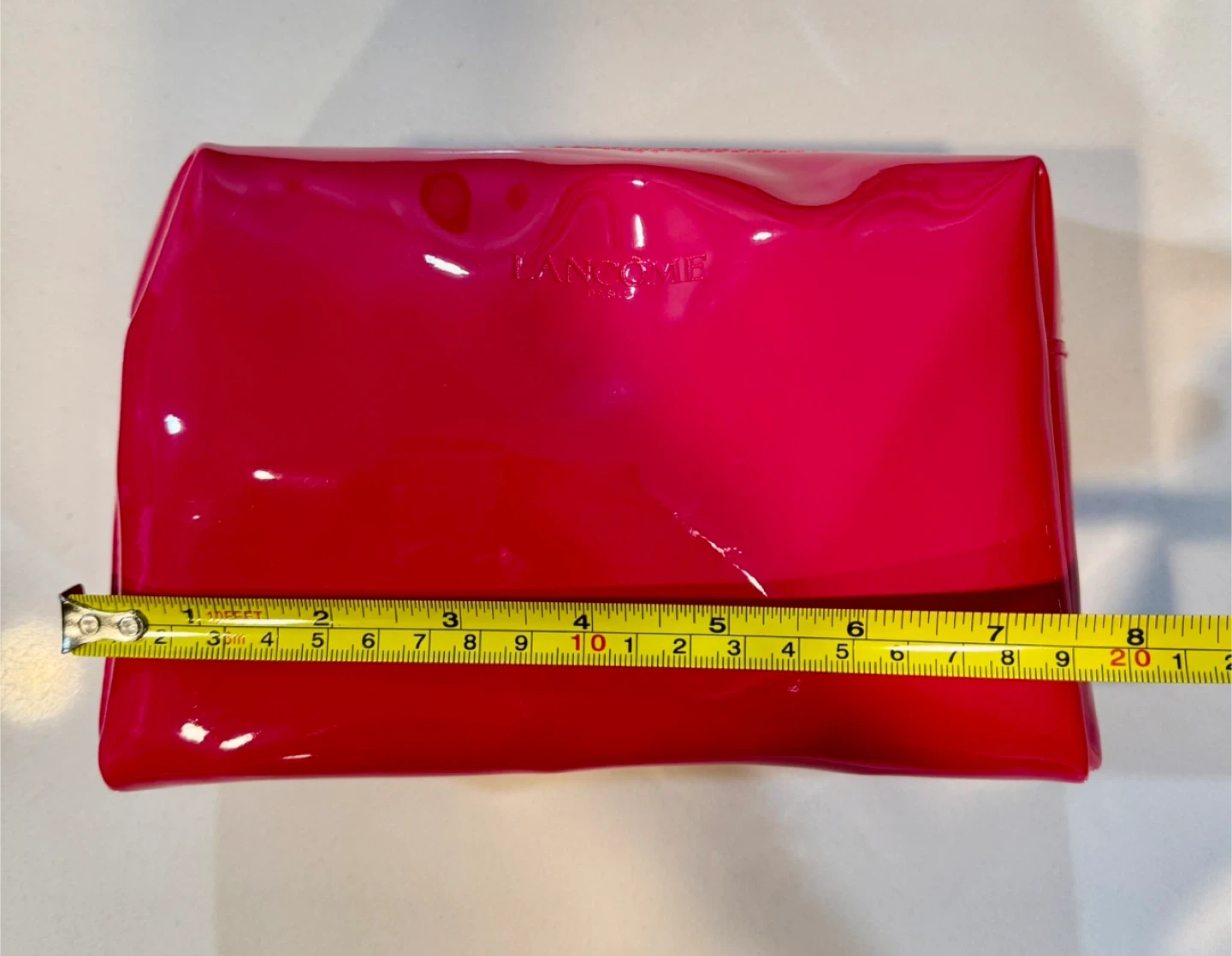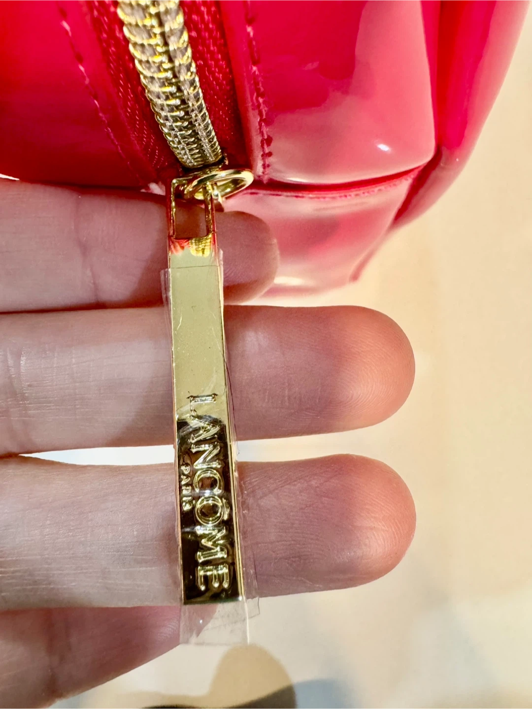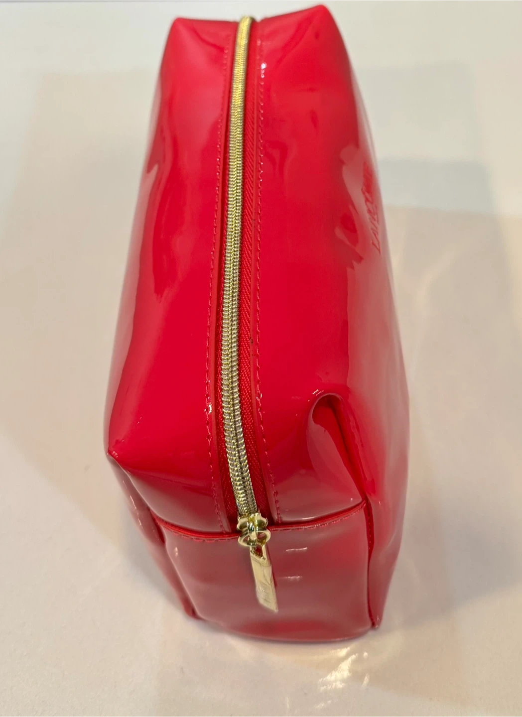 Selling a red Lancôme cosmetic bag. It's in great condition and perfect for storing your makeup or toiletries. The bag features a shiny, patent-leather-like finish and a gold zipper. It's a stylish and practical accessory to keep your essentials organized.