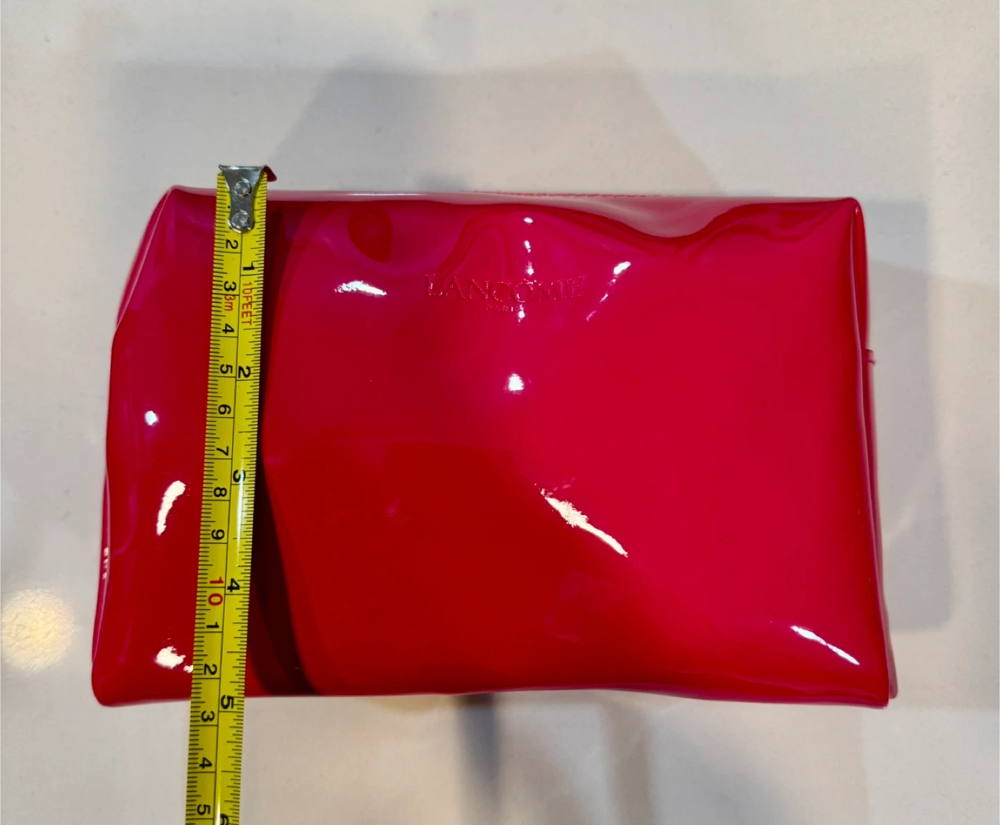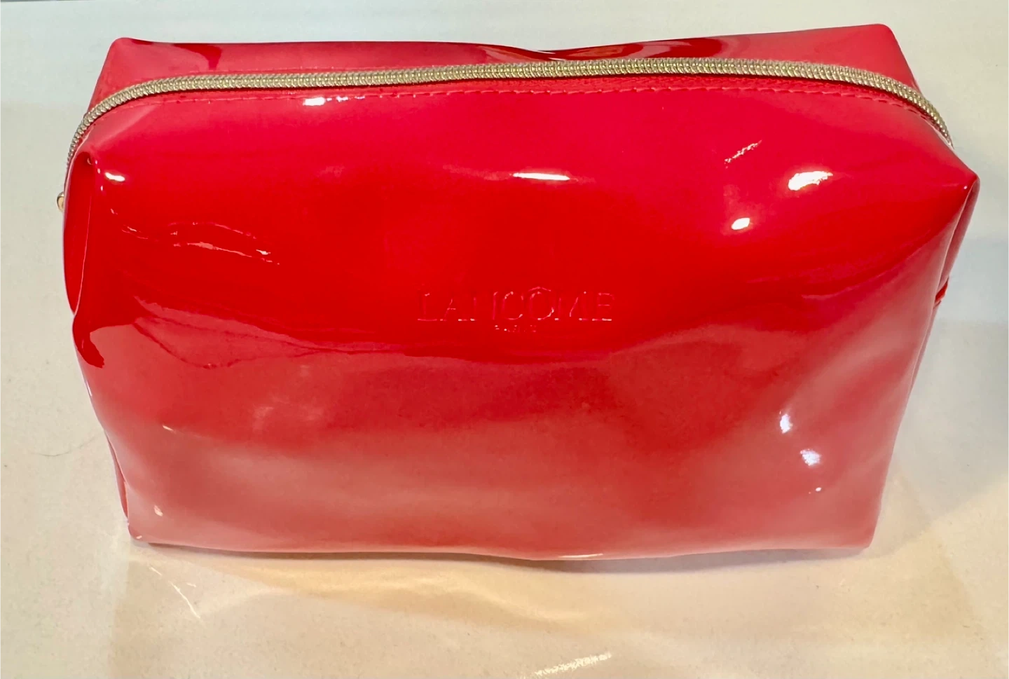 Selling a red Lancôme cosmetic bag. It's in great condition and perfect for storing your makeup or toiletries. The bag features a shiny, patent-leather-like finish and a gold zipper. It's a stylish and practical accessory to keep your essentials organized.
