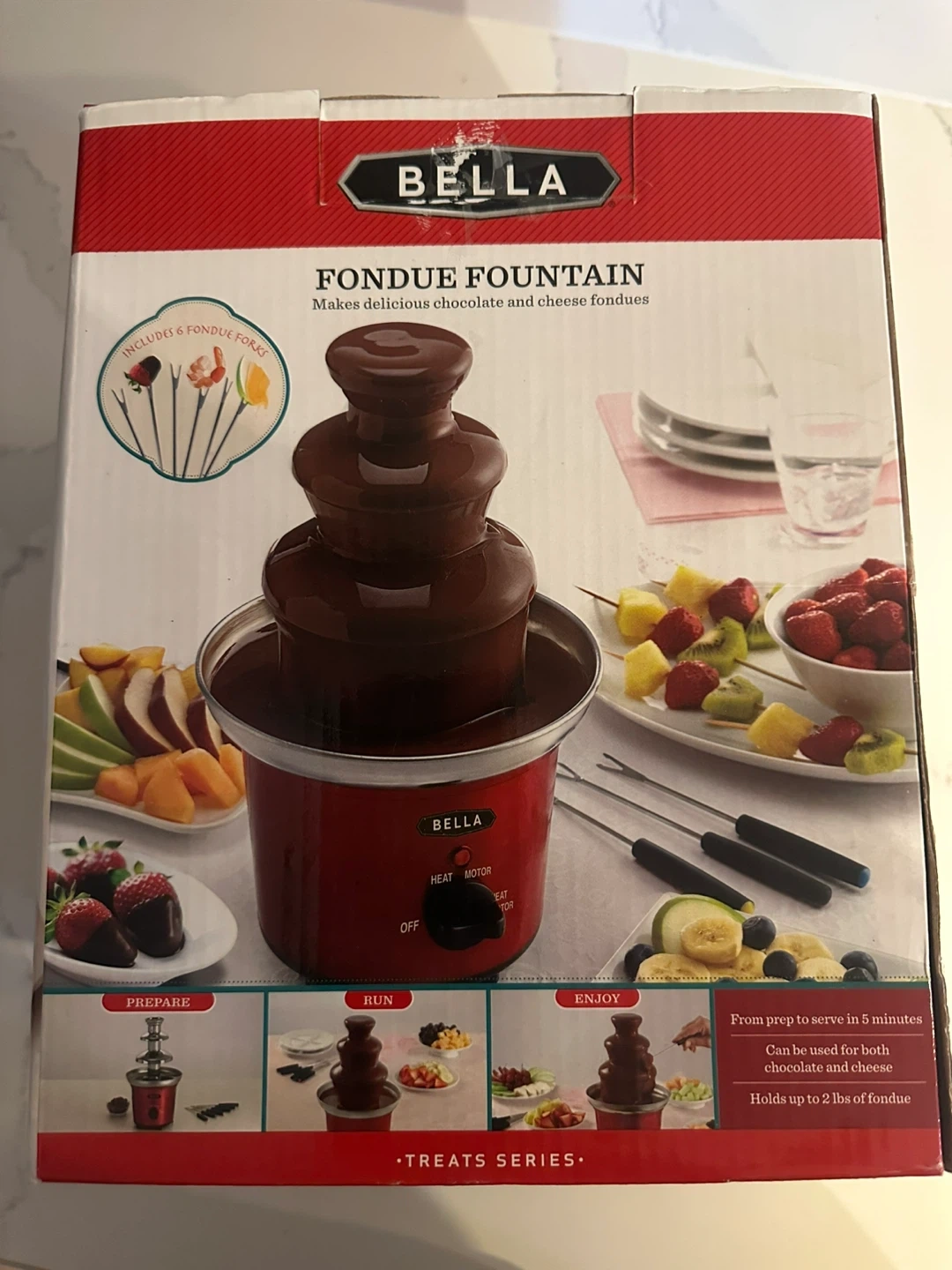 Selling a Bella Fondue Fountain from the Treats Series! It's perfect for delicious chocolate and cheese fondues. The box includes 6 fondue forks. It can be used for both chocolate and cheese and holds up to 2 lbs of fondue. It can be ready to serve in 5 minutes