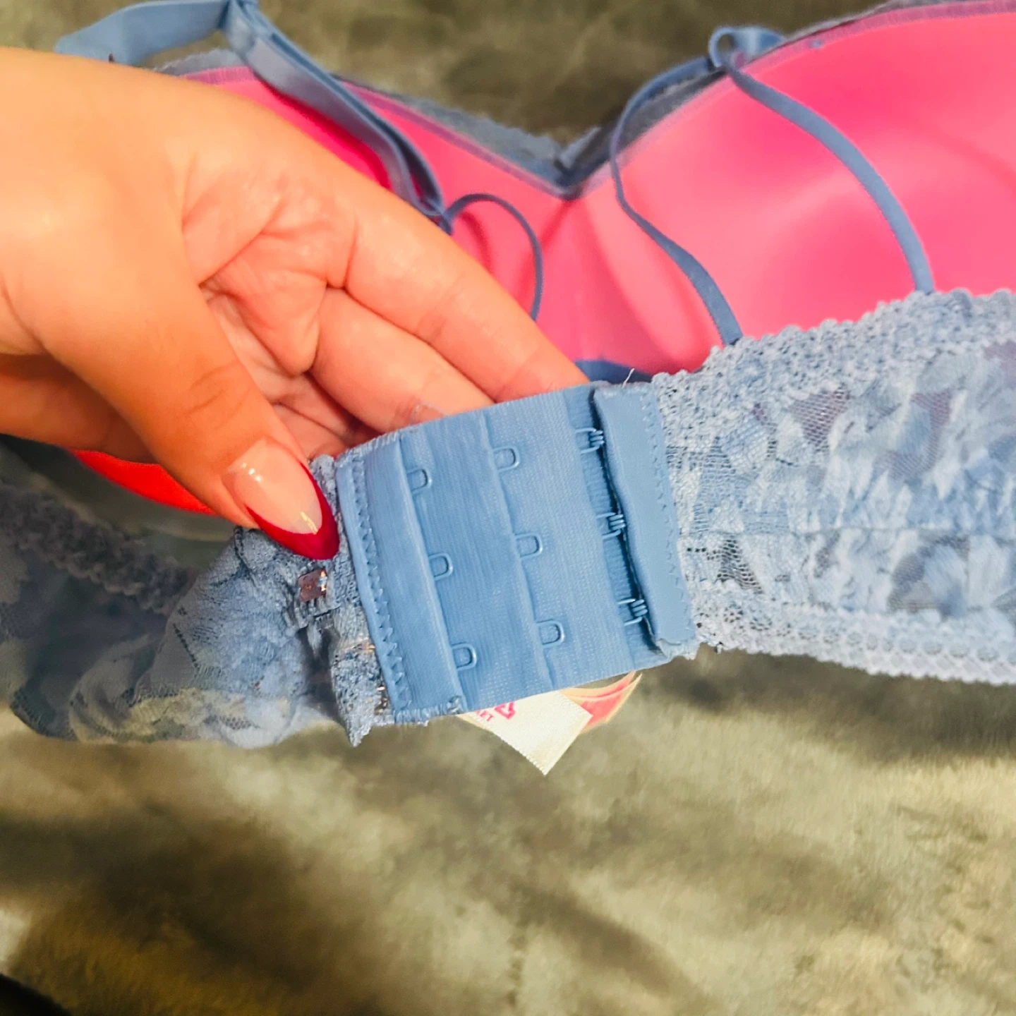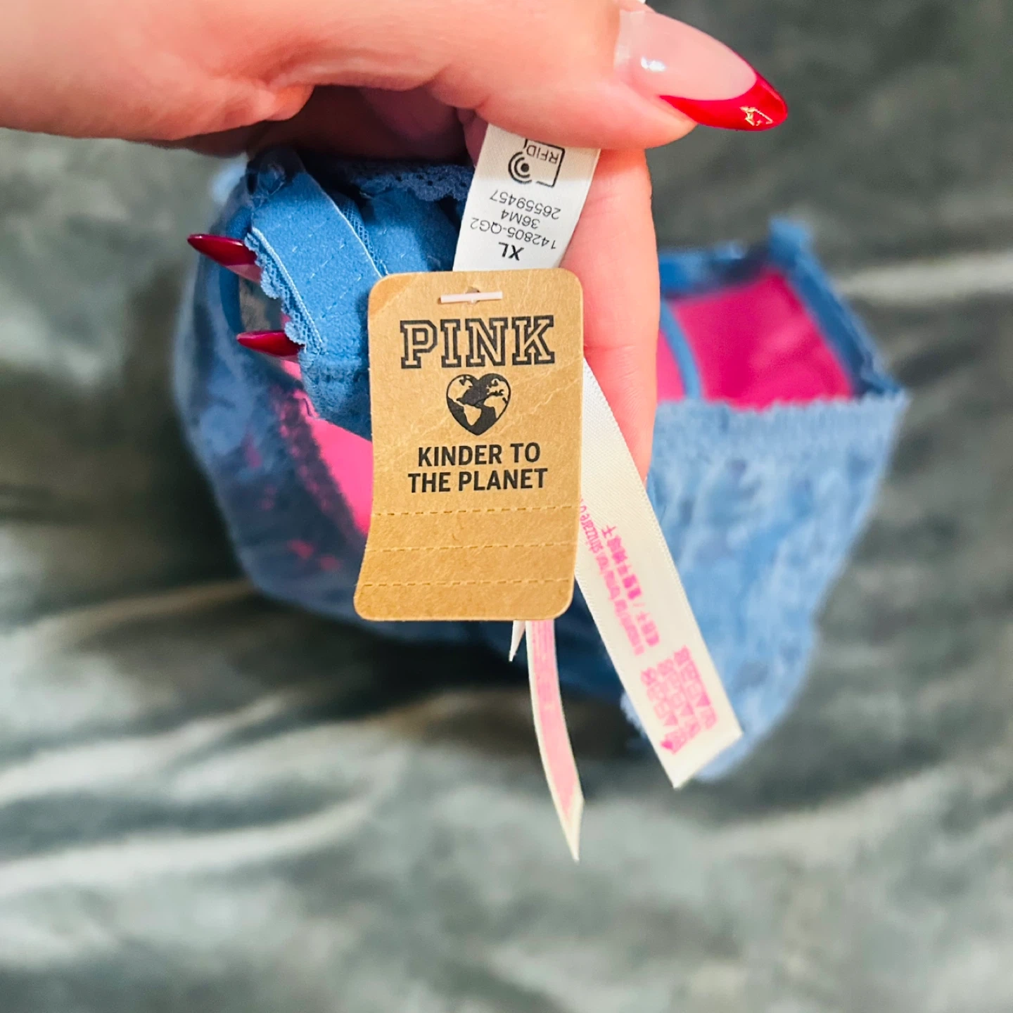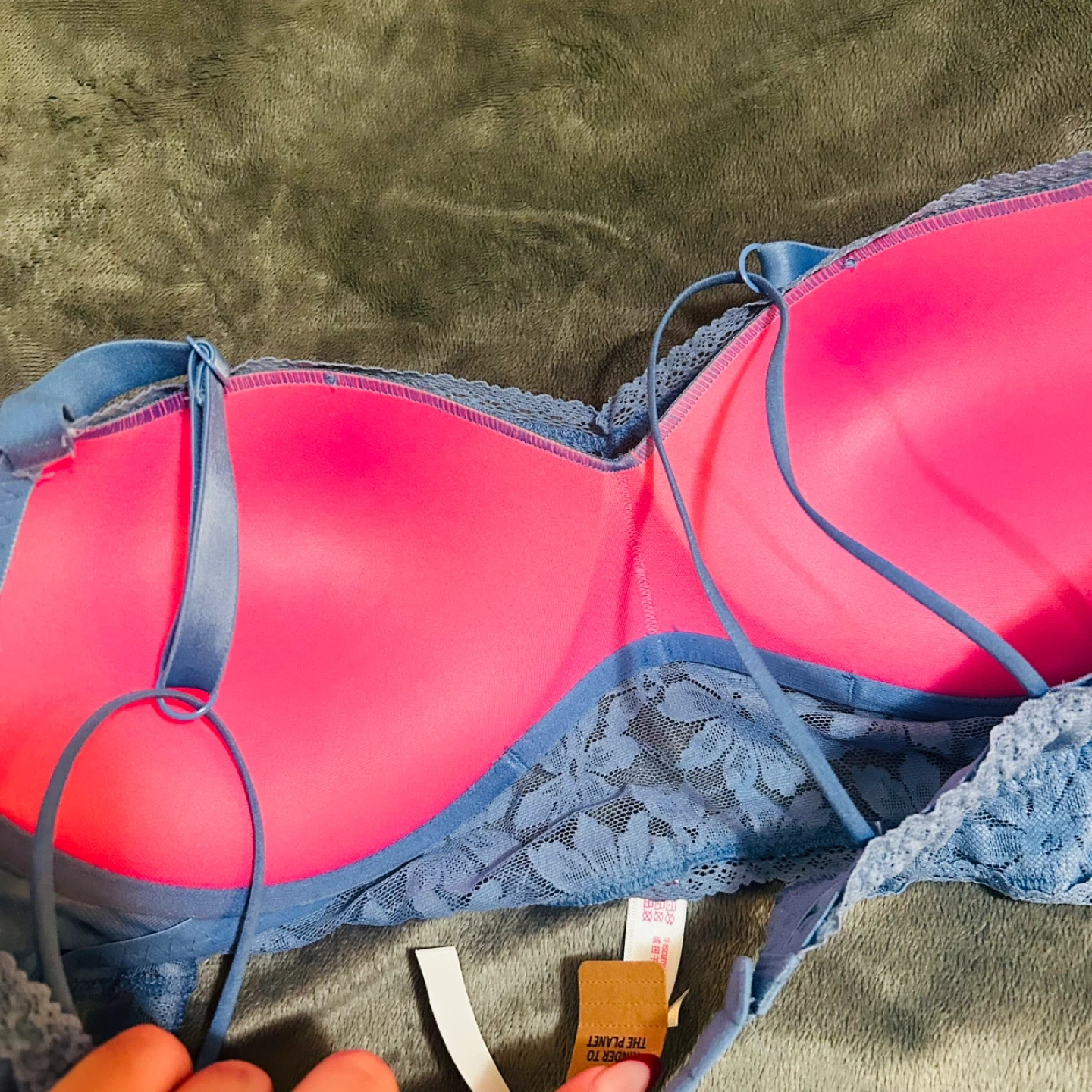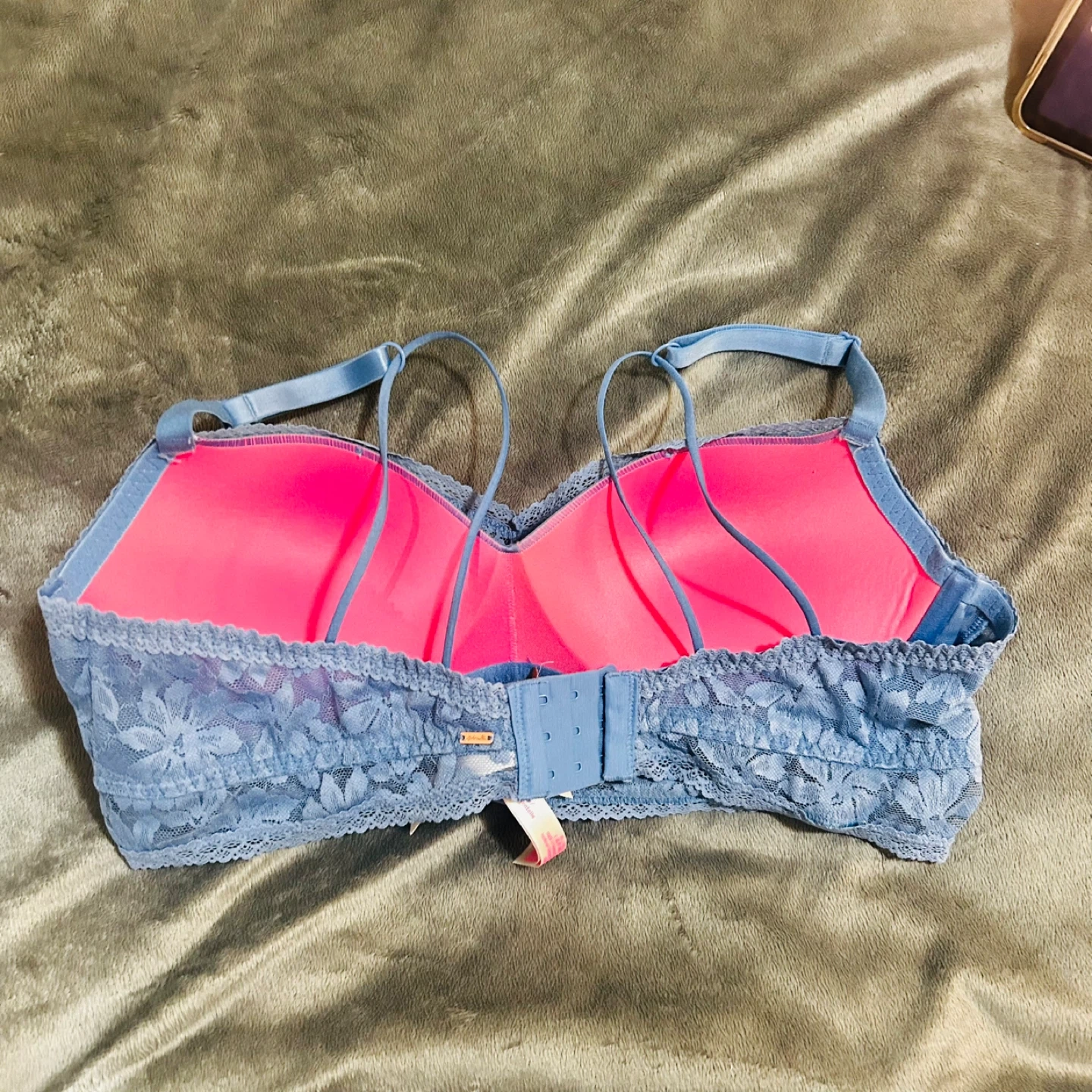 Selling a pretty blue lace bra from PINK in size XL. It's in great condition and has a lovely floral lace design. The inside is a vibrant pink colour. Perfect for everyday wear!