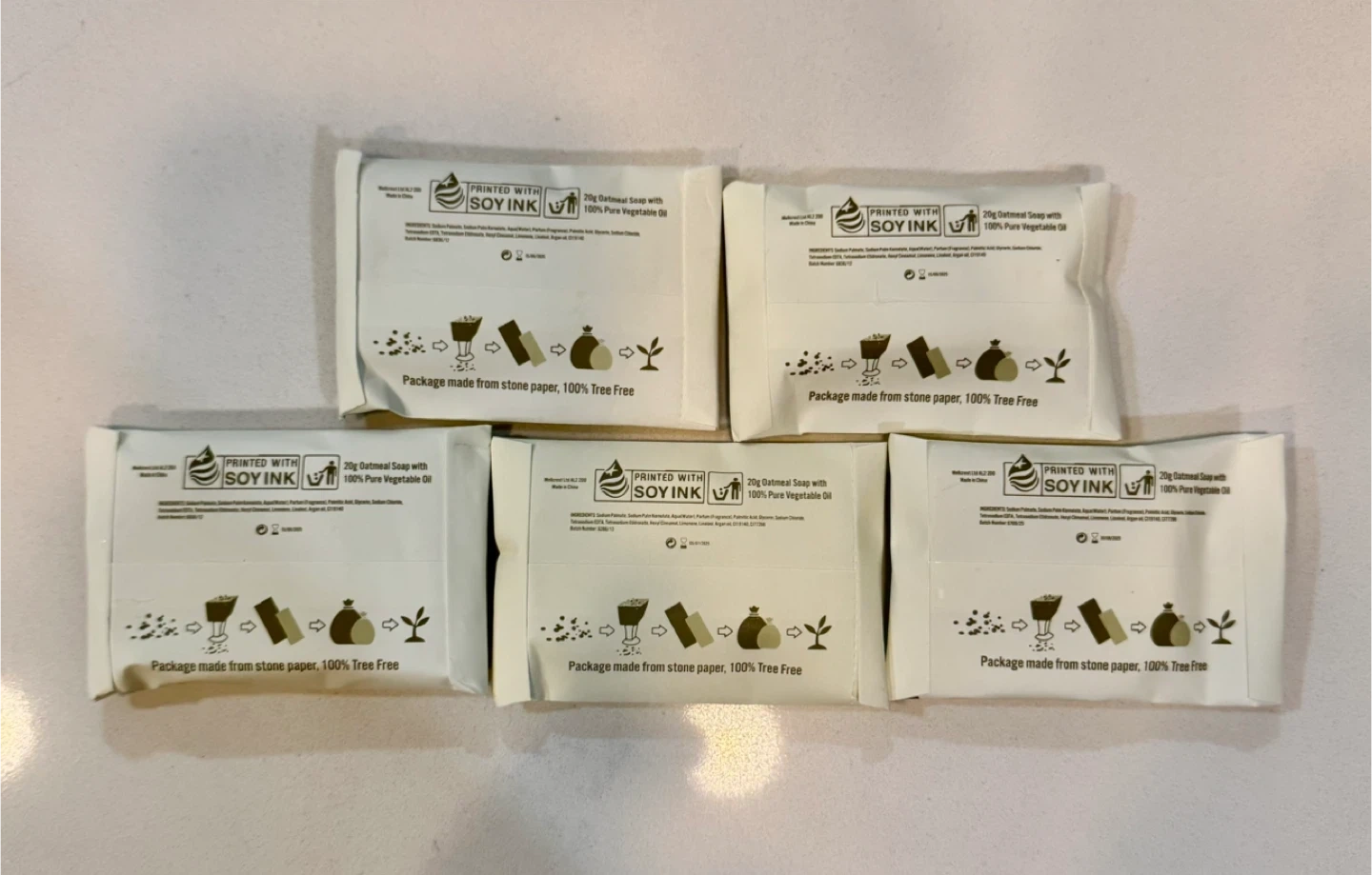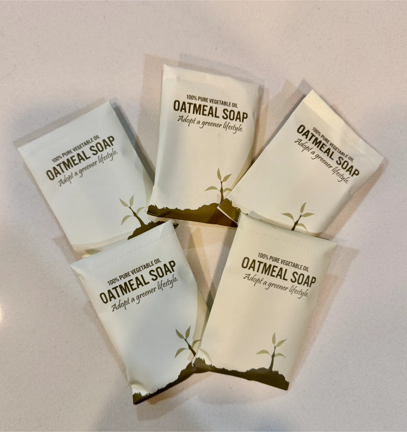 Selling a 5 pack of oatmeal soap. It's made with 100% pure vegetable oil, and the package is made from stone paper and is tree free. Each soap is 20g.