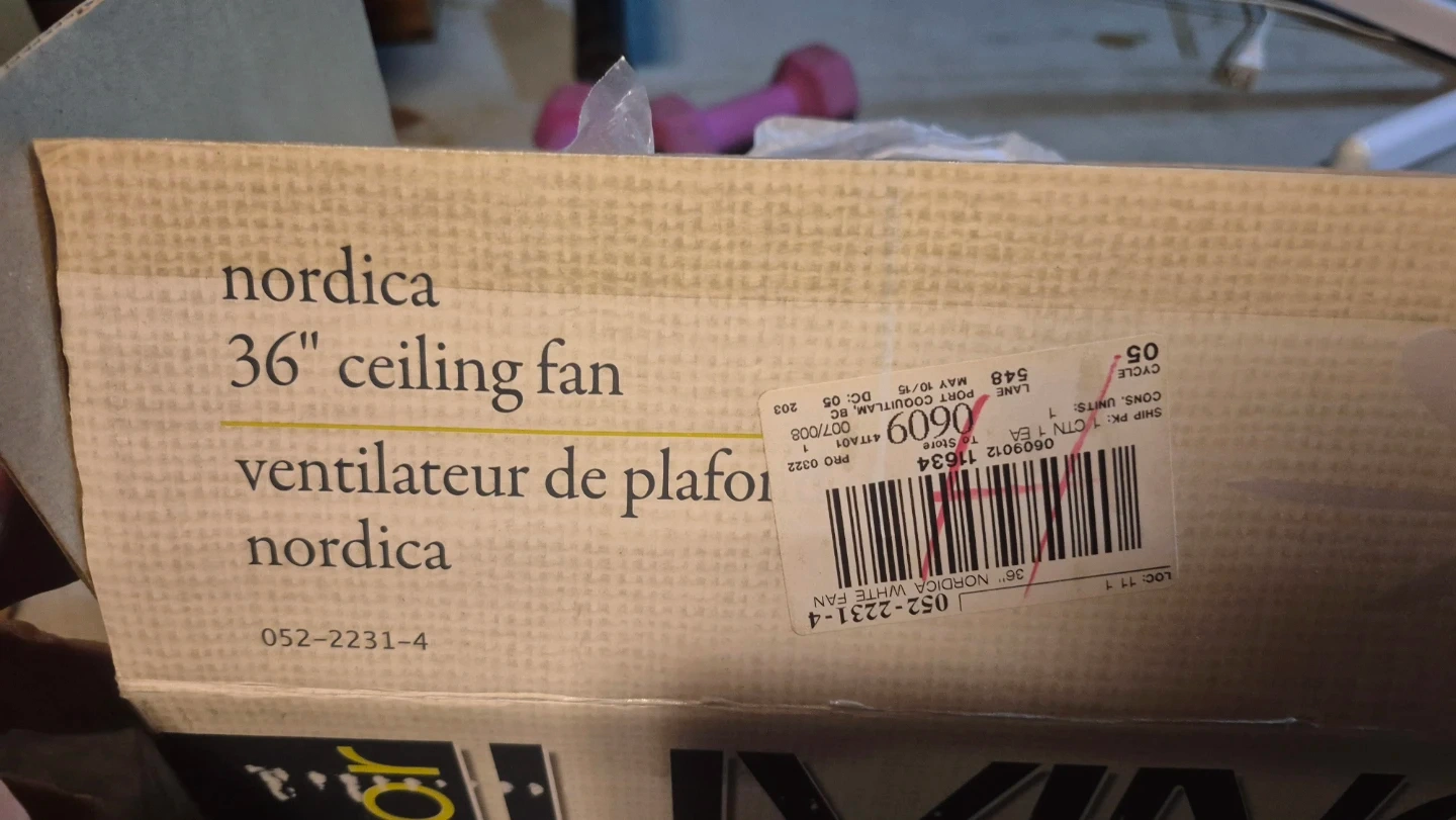 Selling a brand new Nordica 36" ceiling fan, still in its original box! It features a white finish with an opal glass light shade and 5 white blades. It also has forward and reverse 3 speeds, and includes a 190 W limiter for energy savings