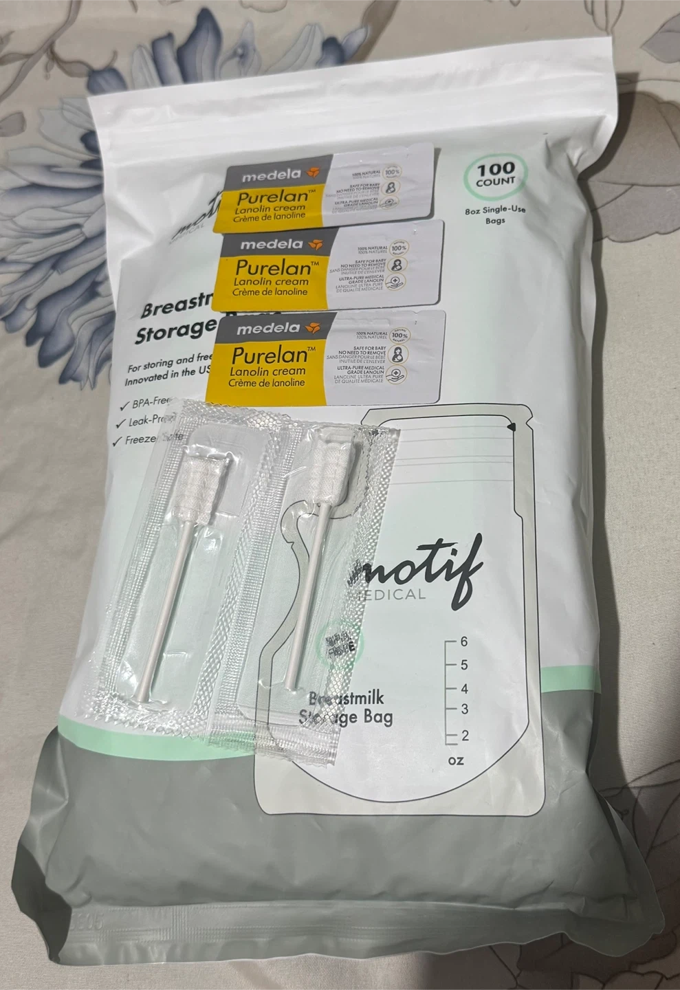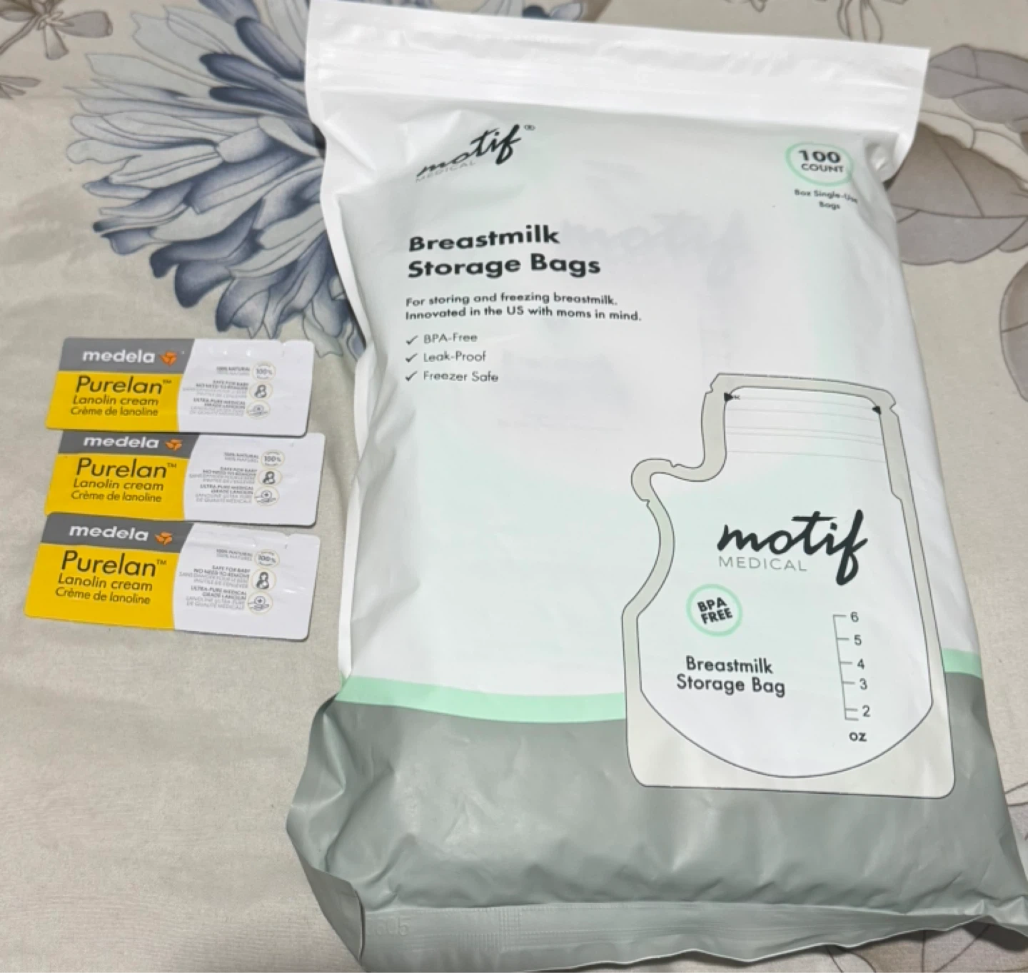 Selling Medela Purelan Lanolin Cream and Motif Breastmilk Storage Bags! The storage bags are great for storing and freezing breastmilk, and they're BPA-free, leak-proof, and freezer-safe. Also included are some Medela Purelan Lanolin Cream samples.