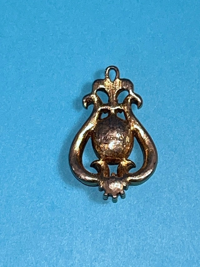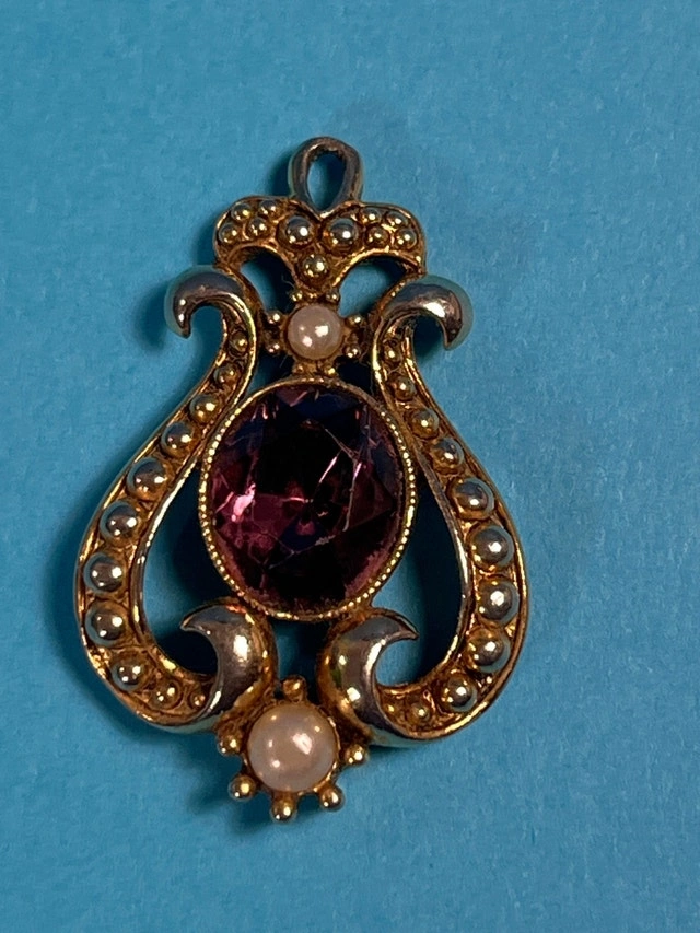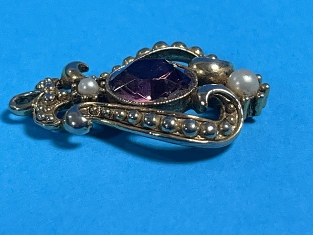This is an Avon pendant featuring a faux amethyst stone and faux pearl embellishments, showcasing a vintage aesthetic and intricate design. Being a previously enjoyed item, it carries a certain charm . If the ad is up, it's still available!
