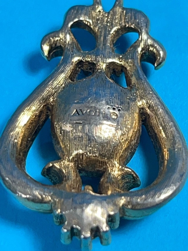 This is an Avon pendant featuring a faux amethyst stone and faux pearl embellishments, showcasing a vintage aesthetic and intricate design. Being a previously enjoyed item, it carries a certain charm . If the ad is up, it's still available!