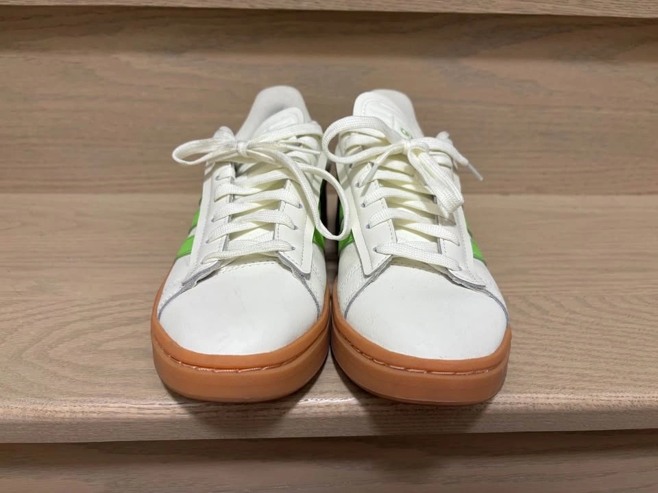 Color: Clean white upper with fresh green Adidas side stripes, classic gum sole