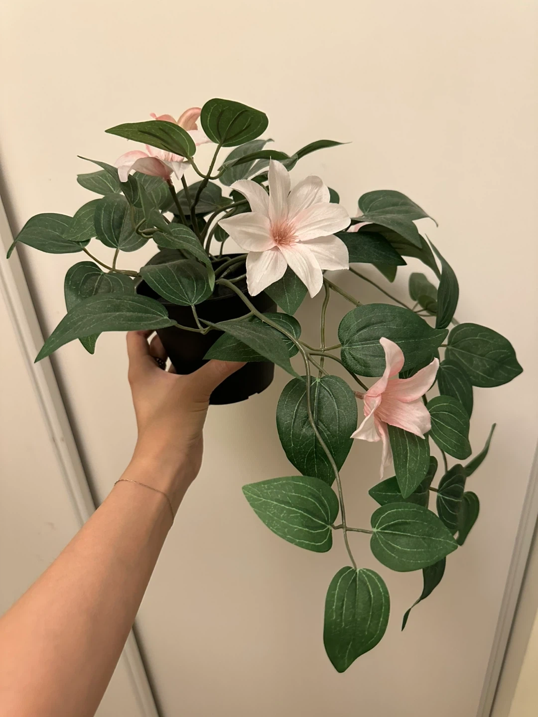 Selling a plant with delicate pink and white flowers. It's in great condition and would be a nice addition to any room! The plant has a realistic look and feel, perfect for adding a touch of nature to your home without the upkeep.