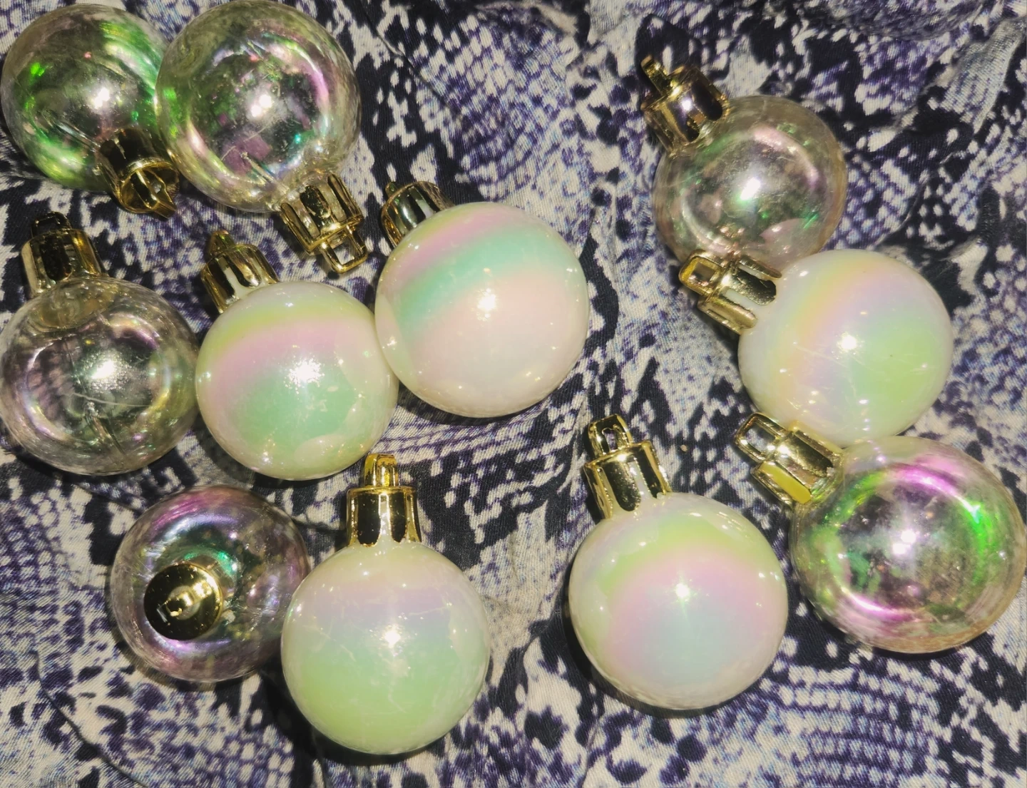 Here are some plastic Christmas ornaments! They have a beautiful pearly finish with hints of green, pink, and purple. Perfect for adding a touch of magic to your tree this holiday season. Pick up only unless near intersection of Oxford and Gammage Street.