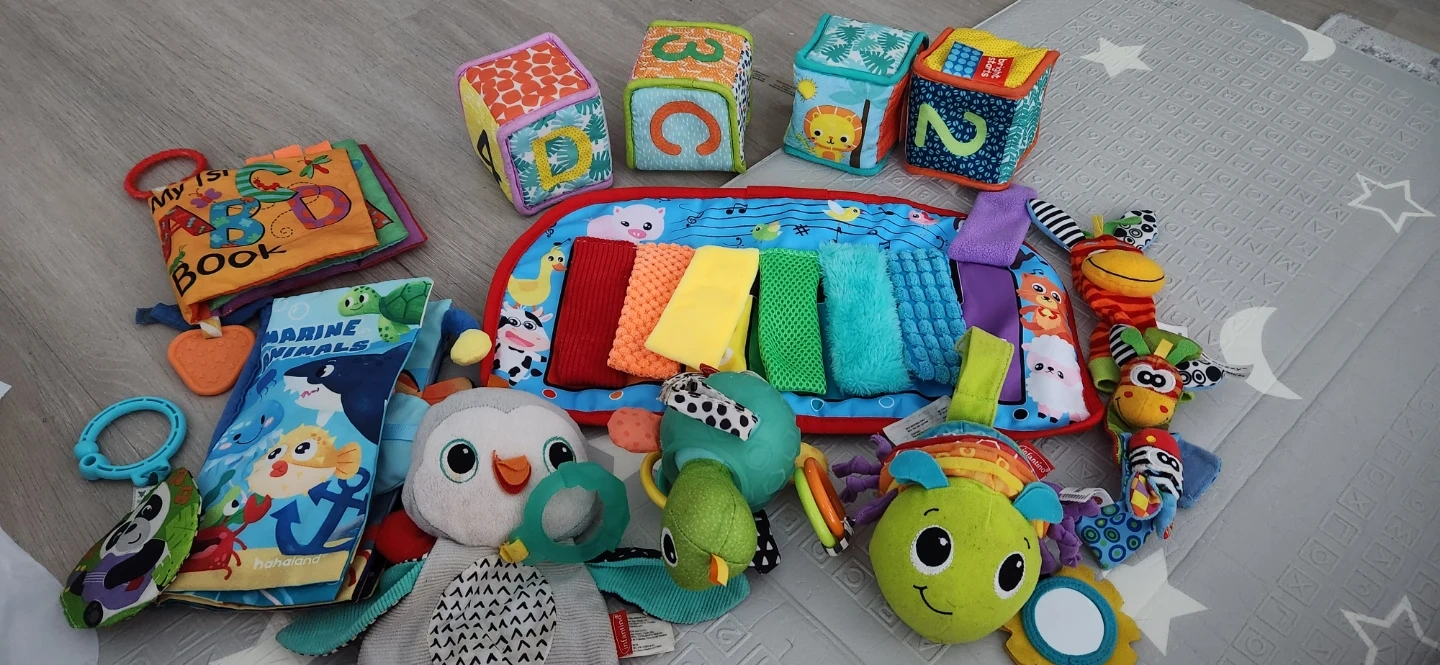 FREE bundle of baby toys including Infantino, bright star and Hahaland items. There are soft blocks, a piano mat, and various plush toys with different textures and colours. These toys are great for sensory development and early learning!
