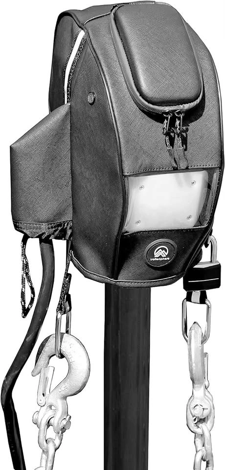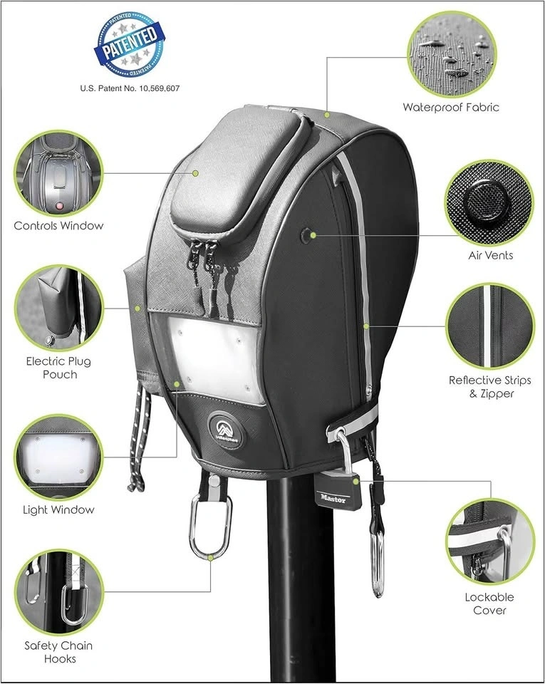Lock grommet provide security opportunities, glow in the dark strips provide easy visibility, a side zipper provides easy placements of the Clever Cover.