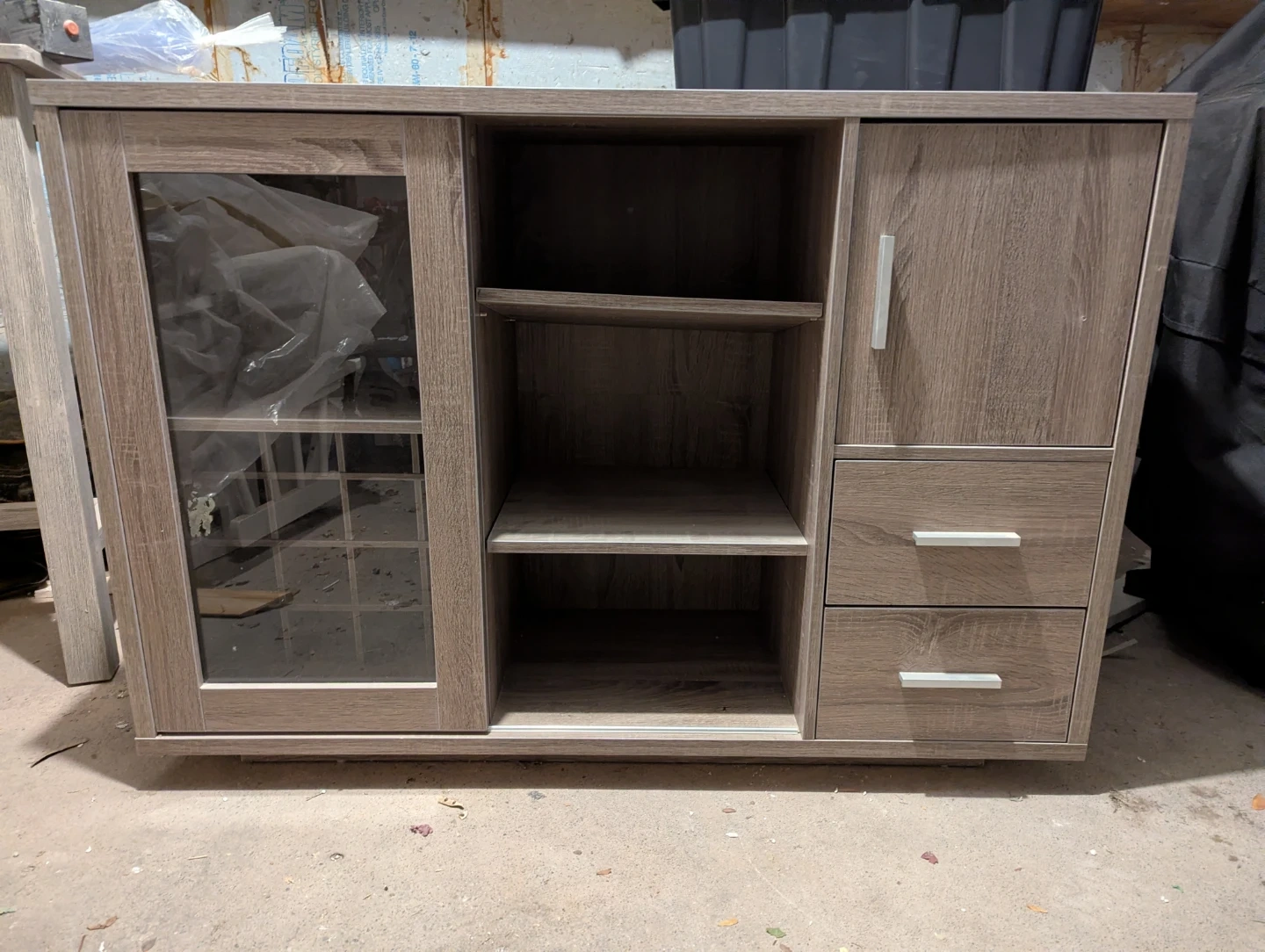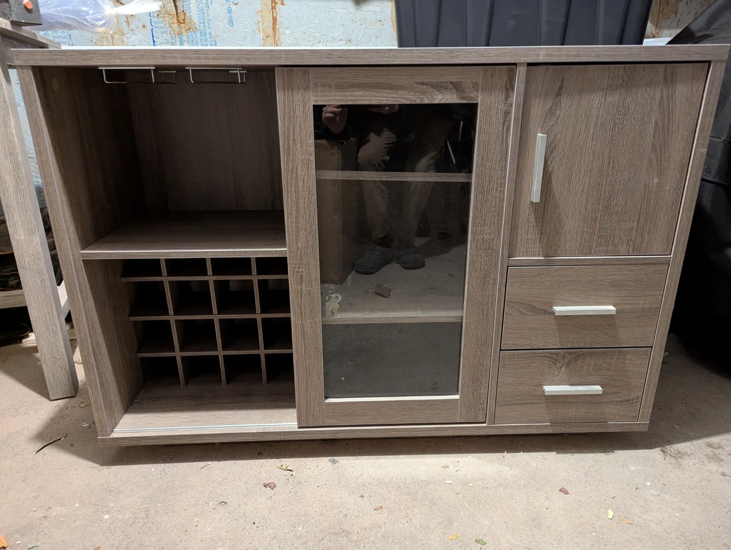 Selling a lovely wooden sideboard! It has a sliding glass door on one side, open shelving, cabinet and drawers, and wine storage for 12 bottles. Looks great and has plenty of space for storage