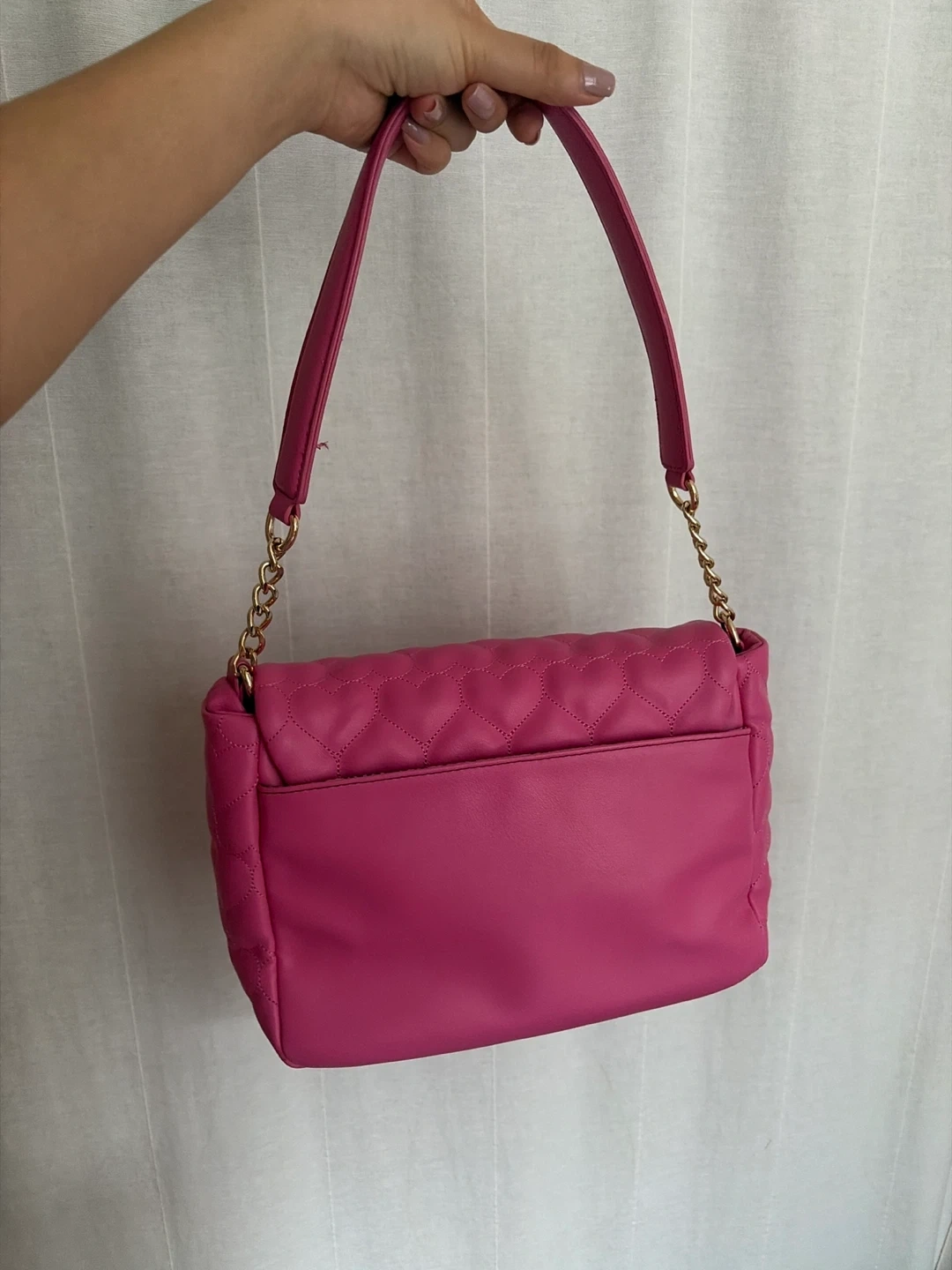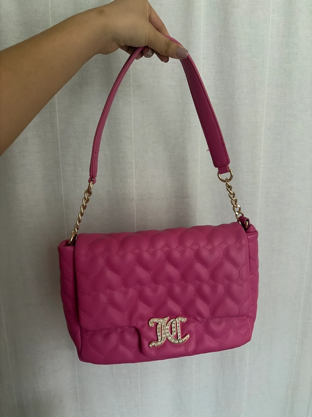 This is a cute Juicy Couture shoulder bag in a vibrant pink colour! It features a quilted design and a gold chain detail on the strap. Perfect for adding a pop of colour to your outfit