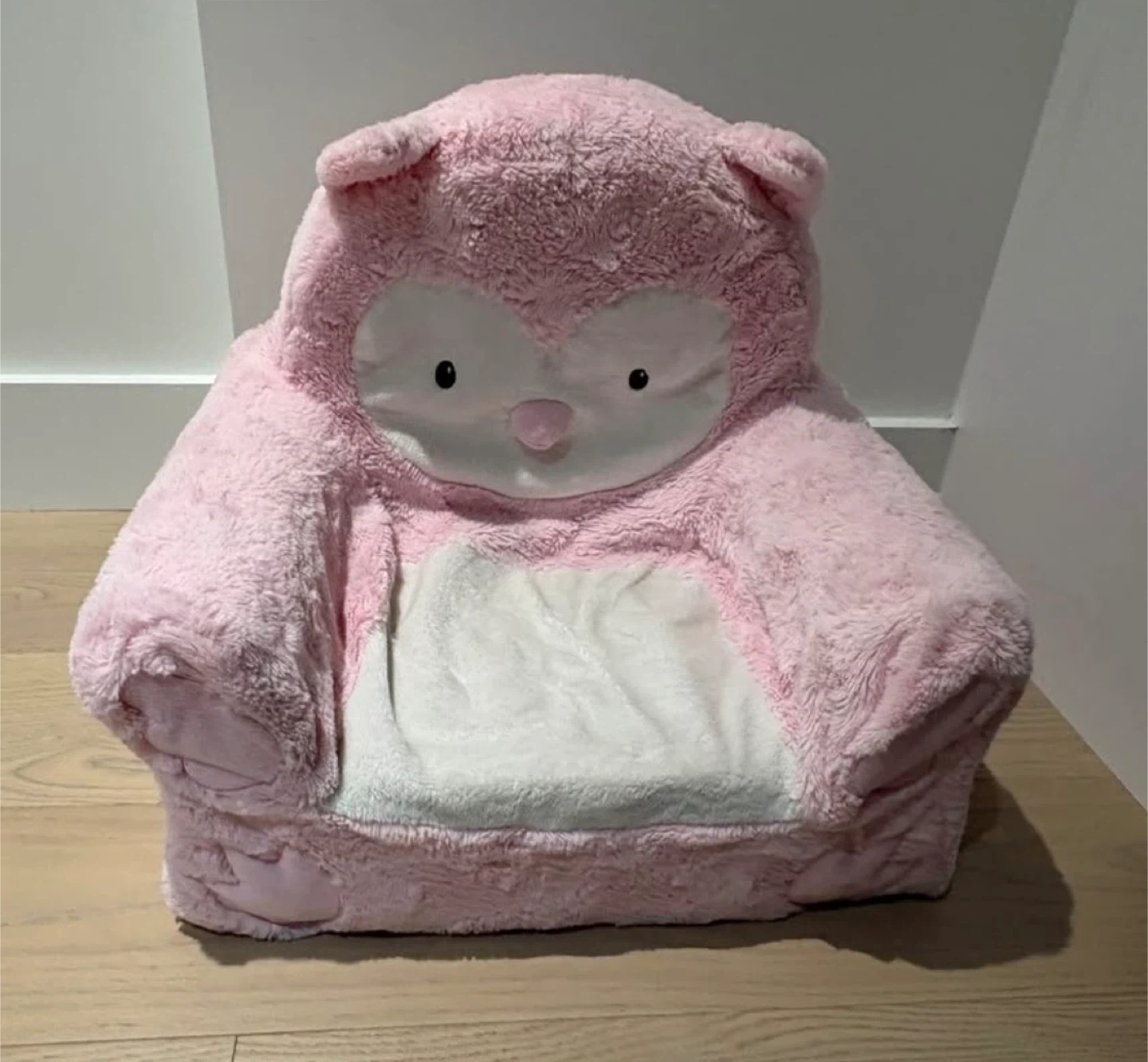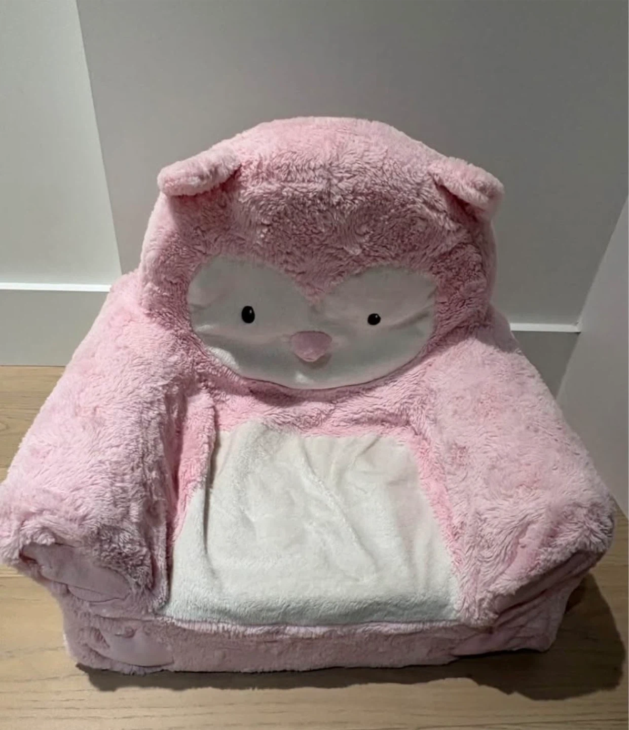 Selling a super cute and comfy pink owl character chair for kids! It's in great condition and made of soft, plush material. Perfect for reading, relaxing, or just adding a touch of fun to any room! Tiny stain shown in last photo.